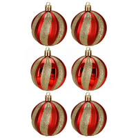 Bombki choinkowe czerwone 6 szt. 7 cm matowe i błyszczące złoty brokat, ze sznureczkami