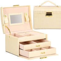 Kuferek, szkatułka na biżuterię 17,5x14x12,5 cm ecru z szufladami i lusterkiem