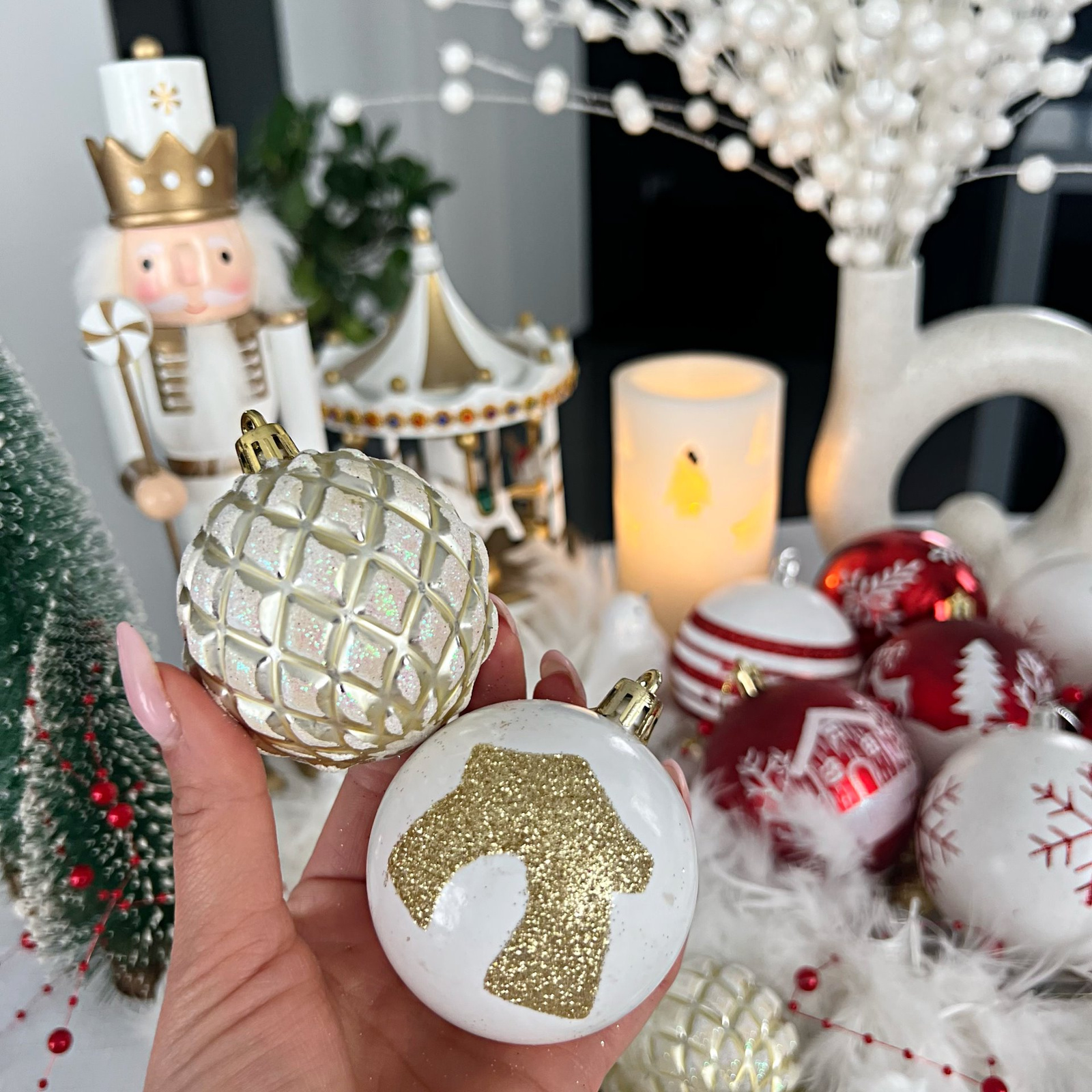 Bombki choinkowe to nieodłączny element wystroju choinki, dzięki któremu bożonarodzeniowe drzewka błyszczą się i mienią w świetle świątecznych lampek. Z naszym zestawem czerwono-białych bombek choinkowych stworzysz jedyne w swoim rodzaju dekoracje i nadasz wnętrzom niepowtarzalnego klimatu bożonarodzeniowego. W komplecie otrzymujesz bombki o rozmaitych zdobieniach, idealnie nadające się do przyozdabiania choinki oraz tworzenia świątecznych stroików i girland. Wszystko to zapakowane w poręcznym pudełku. Nietłukące się bombki to najlepszy wybór dla osób mieszkających z małymi dziećmi i zwierzętami, którym należy zapewnić maksymalne bezpieczeństwo. Ozdoby z tworzywa sztucznego nie pękają po przypadkowym upuszczeniu lub spadnięciu z gałązki drzewka, dlatego do strojenia choinki mogą przyłączyć się także dzieci. Niespodziewane przewrócenie choinki z nietłukącymi się bombkami również nie będzie stanowić problemu, gdyż żadna zawieszka nie ulegnie zniszczeniu. Stwórz magiczny klimat wraz z pięknymi ozdobami świątecznymi naszej marki!