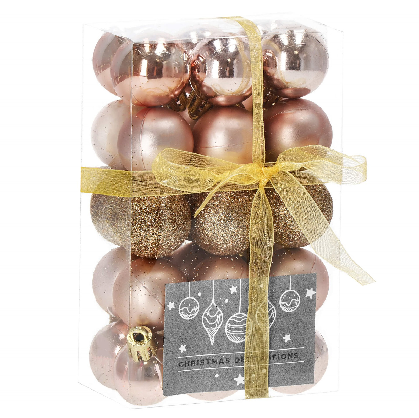 Bombki choinkowe to nieodłączny element wystroju choinki, dzięki któremu bożonarodzeniowe drzewka błyszczą się i mienią w świetle świątecznych lampek. Z naszym zestawem różowo-złotych bombek choinkowych stworzysz jedyne w swoim rodzaju dekoracje i nadasz wnętrzom niepowtarzalnego klimatu bożonarodzeniowego. W komplecie otrzymujesz bombki o rozmaitych zdobieniach: półmatowe, brokatowe, połyskujące, idealnie nadające się do przyozdabiania choinki oraz tworzenia świątecznych stroików i girland. Wszystko to zapakowane w poręcznym pudełku. Nietłukące się bombki to najlepszy wybór dla osób mieszkających z małymi dziećmi i zwierzętami, którym należy zapewnić maksymalne bezpieczeństwo. Ozdoby z tworzywa sztucznego nie pękają po przypadkowym upuszczeniu lub spadnięciu z gałązki drzewka, dlatego do strojenia choinki mogą przyłączyć się także dzieci. Niespodziewane przewrócenie choinki z nietłukącymi się bombkami również nie będzie stanowić problemu, gdyż żadna zawieszka nie ulegnie zniszczeniu. Stwórz magiczny klimat wraz z pięknymi ozdobami świątecznymi naszej marki!