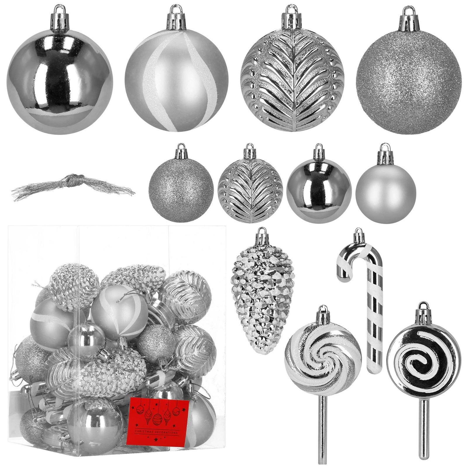 Bombki choinkowe 40 szt. okrągłe, lizaki, szyszki, laski cukrowe nietłukące ozdoby srebrne