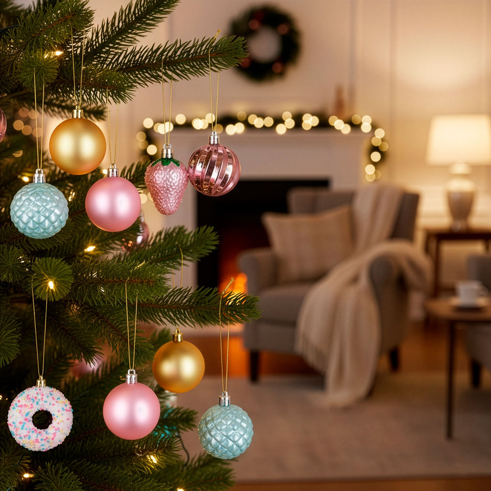 Wyobraź sobie dekorację świąteczną, w której każda bombka opowiada swoją historię zestaw 69 wielobarwnych ozdób oferuje właśnie taką możliwość. Kuliste formy w odcieniach złota, różu, błękitu stanowią harmonijną bazę, a obok nich pojawiają się bombki-słodkości: babeczki, pączki, lody oraz truskawki, które wprowadzają do wnętrza beztroski nastrój i kreatywny akcent. Kształty klasyczne wpasowują się w każdą gałązkę, natomiast motywy deserowe mogą zostać zawieszone w cienkich partiach drzewka lub włączyć się jako element dekoracji stołu np. zawieszone na pęku gałązek postawionym w wazonie. Złote bombki połyskujące i półmatowe dodają elegancji i świetnie współgrają z naturalnym zielonym tłem świerku. Pastelowe tonacje różu i błękitu dodają subtelności i współgrają ze stylami skandynawskimi lub boho. Figury jak domek czy piernik wkomponowują się w styl przytulnego wnętrza mogą zostać zawieszone osobno jako ozdoba przy drzwiach albo element girlandy na ścianie. Całość zestawu daje możliwość udekorowania nie tylko głównego drzewka, ale również mniejszych elementów: mini choinki w kuchni, wieńca na drzwiach, dekoracji schodów lub kominka. Dzięki różnorodności wzorów i kolorów każda przestrzeń nabiera indywidualnego charakteru od klasyki po słodki akcent. Można eksperymentować z układem: segment z klasycznymi kulami, segment z motywami słodkości, segment pastelowy wszystko w ramach jednego zestawu. Kolory i formy współgrają z ozdobami stołowymi sprawiają, że cały dom lśni i przyciąga wzrok. Zestaw ten pozwala wprowadzić do wnętrza świąteczną radość i kreatywność bez dodatkowych wysiłków. Bombki można łatwo przearanżować w przyszłym roku wystarczy zamienić układ, by uzyskać zupełnie inny efekt. Dzięki nim dekorowanie staje się zabawą i przestrzenią dla wyobraźni.