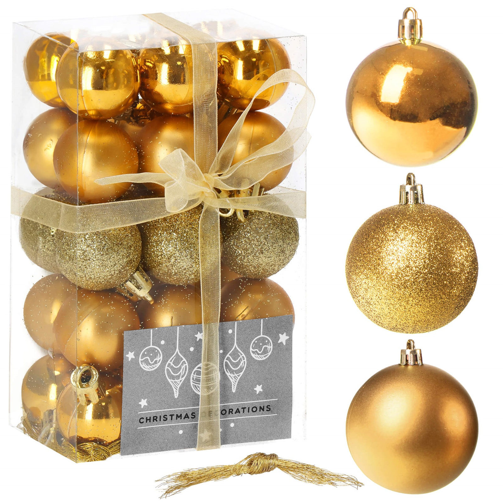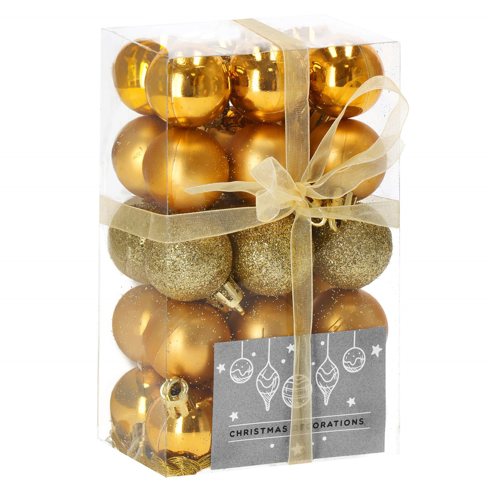 Bombki choinkowe to nieodłączny element wystroju choinki, dzięki któremu bożonarodzeniowe drzewka błyszczą się i mienią w świetle świątecznych lampek. Z naszym zestawem złotych bombek choinkowych stworzysz jedyne w swoim rodzaju dekoracje i nadasz wnętrzom niepowtarzalnego klimatu bożonarodzeniowego. W komplecie otrzymujesz bombki o rozmaitych zdobieniach: brokatowych, matowych i błyszczących, idealnie nadające się do przyozdabiania choinki oraz tworzenia świątecznych stroików i girland. Wszystko to zapakowane w poręcznym pudełku. Nietłukące się bombki to najlepszy wybór dla osób mieszkających z małymi dziećmi i zwierzętami, którym należy zapewnić maksymalne bezpieczeństwo. Ozdoby z tworzywa sztucznego nie pękają po przypadkowym upuszczeniu lub spadnięciu z gałązki drzewka, dlatego do strojenia choinki mogą przyłączyć się także dzieci. Niespodziewane przewrócenie choinki z nietłukącymi się bombkami również nie będzie stanowić problemu, gdyż żadna zawieszka nie ulegnie zniszczeniu. Stwórz magiczny klimat wraz z pięknymi ozdobami świątecznymi naszej marki!