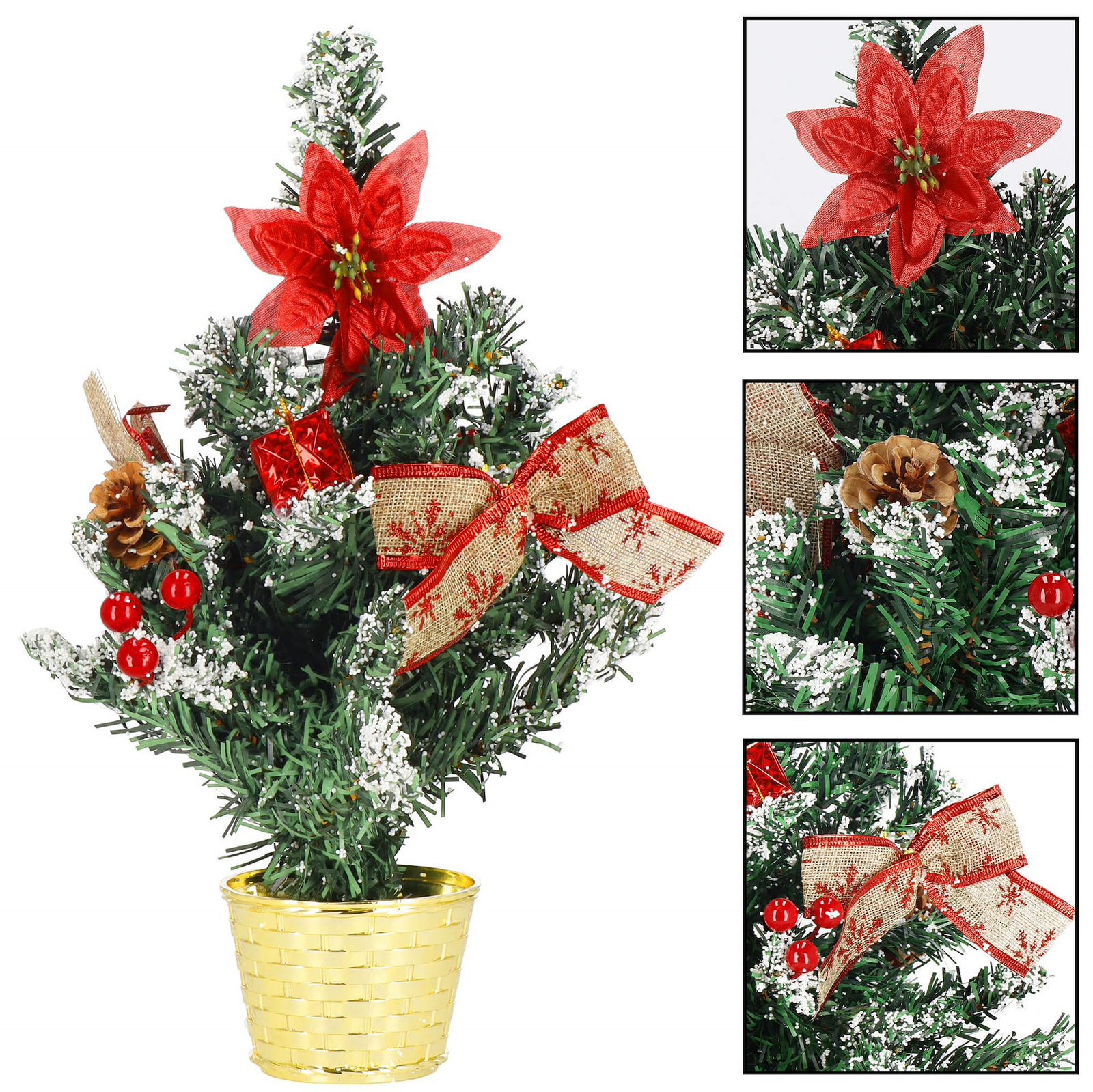 - Dodatkowo: białe zdobienie końcówek gałązek, stabilnie ulokowana z złotej donicy; gałązki można rozłożyć do pozycji horyzontalnej