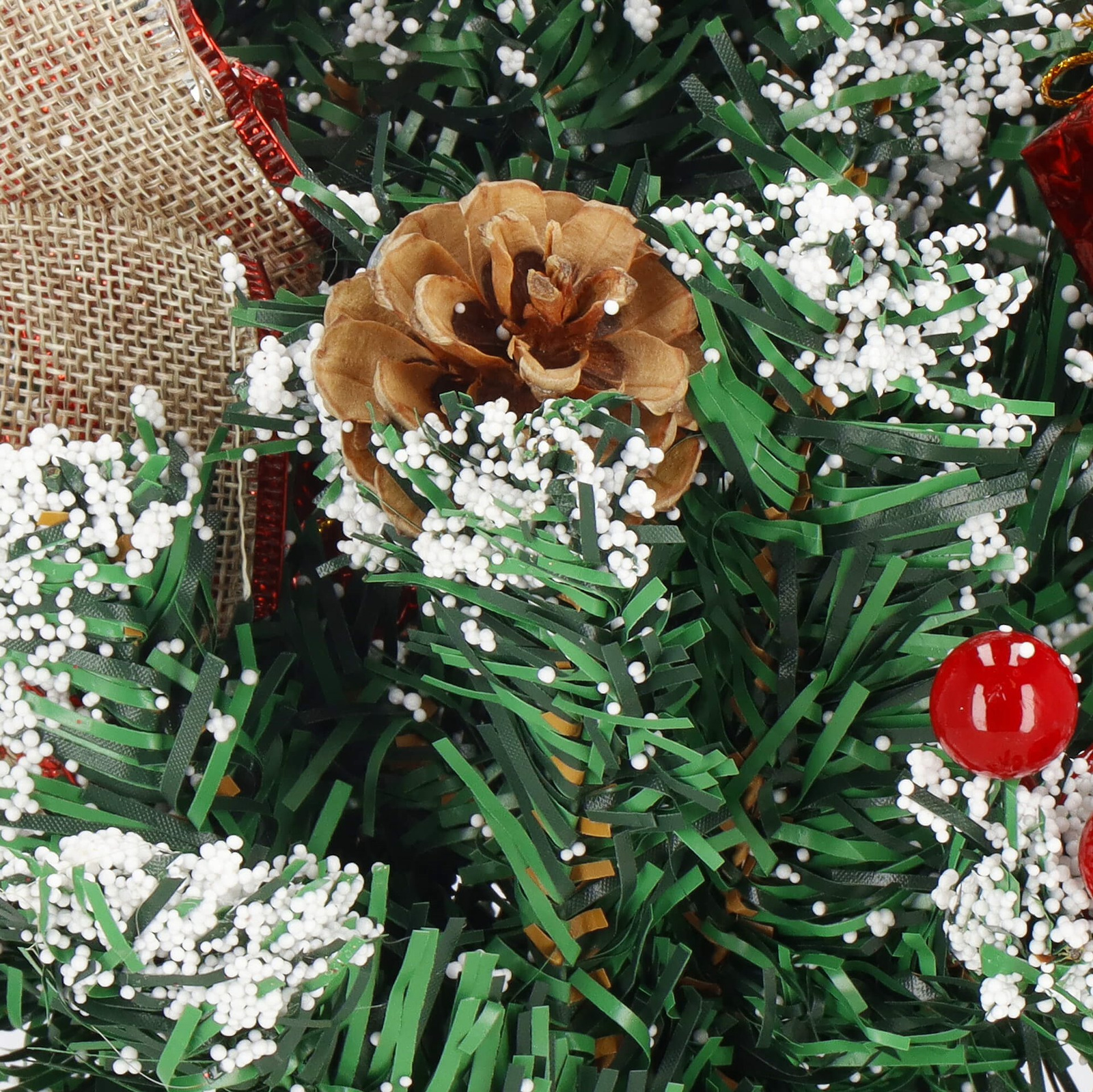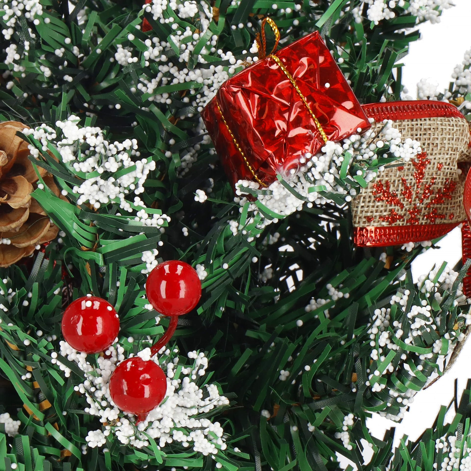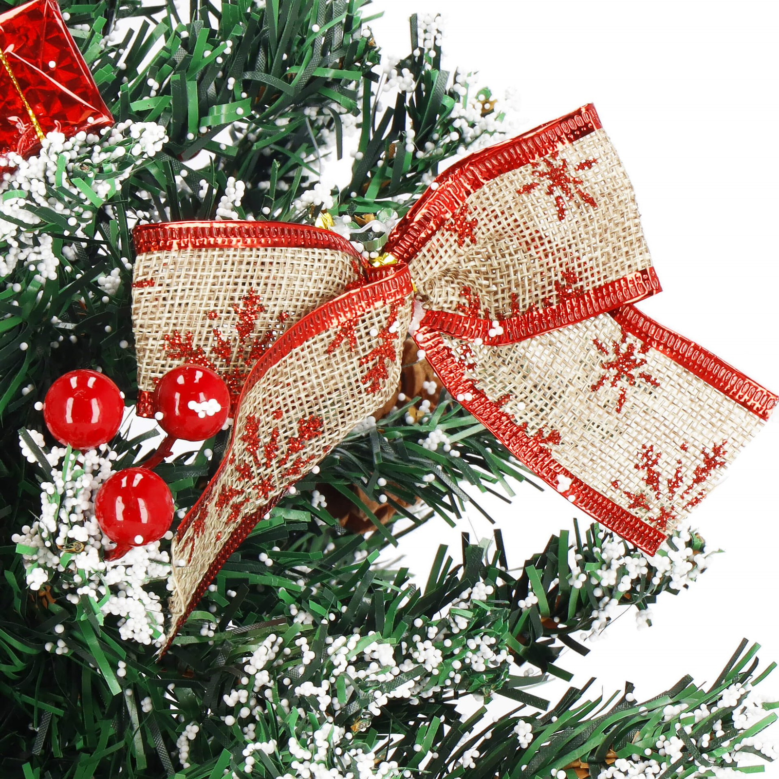 - Zastosowane ozdoby: szyszki, wstążki, prezenty, owoce jarzębiny, gwiazda betlejemska