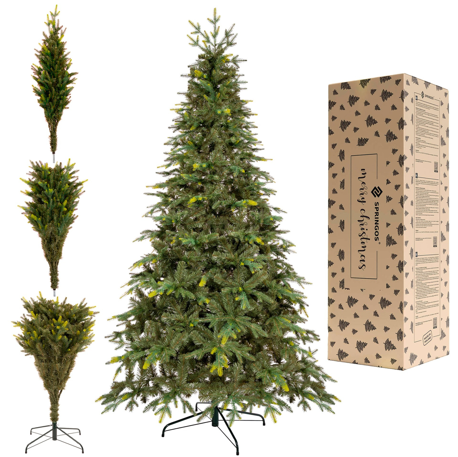 Drzewko doskonale prezentuje się nawet z niewielką ilością dekoracji. Stabilność choinki zapewniona jest dzięki dołączonemu stojakowi, którego wielkość dopasowana jest indywidualnie do rozmiaru choinki. Dużą zaletą podstawy jest jej montaż. Wystarczy wsunąć nóżki w specjalnie przystosowane do tego żłobienia. Po złożeniu stojak zajmuje niewiele miejsca, więc jego przechowywanie nie stanowi problemu. Stylowa choinka od firmy Springos zapakowana została w wytrzymałe pudełko, które idealnie nadaje się do przechowywania drzewka, chroniąc je przed światłem oraz kurzem. Dzięki czemu choinka bożonarodzeniowa zawsze będzie świeża i zielona.