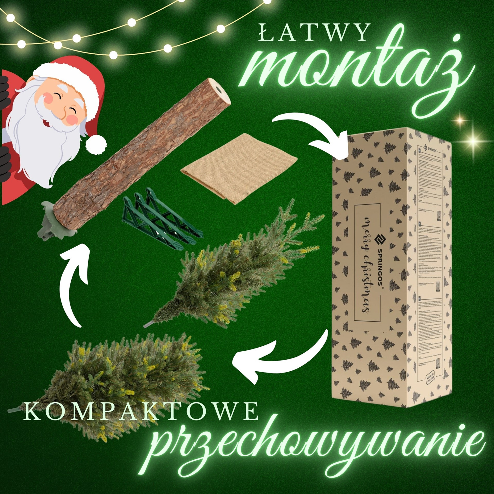 Drzewko doskonale prezentuje się nawet z niewielką ilością dekoracji. Stabilność choinki zapewniona jest dzięki dołączonemu stojakowi, którego wielkość dopasowana jest indywidualnie do rozmiaru choinki. Dużą zaletą podstawy jest jej montaż. Wystarczy wsunąć nóżki w specjalnie przystosowane do tego żłobienia. Po złożeniu stojak zajmuje niewiele miejsca, więc jego przechowywanie nie stanowi problemu. Stylowa choinka od firmy Springos zapakowana została w wytrzymałe pudełko, które idealnie nadaje się do przechowywania drzewka, chroniąc je przed światłem oraz kurzem. Dzięki czemu choinka bożonarodzeniowa zawsze będzie świeża i zielona. W zestawie otrzymujesz materiał jutowy do zakrycia stojaka.