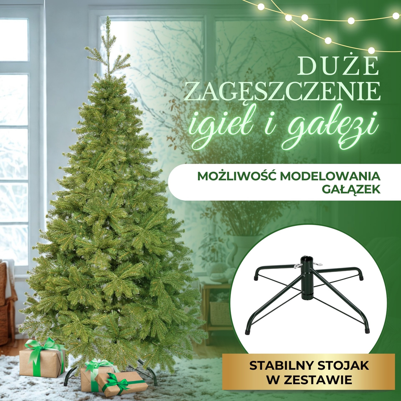Choinka od marki Springos została wykonana z najlepszych jakościowo materiałów. Drzewko mierzące 180 cm posiada bujną koronę o pięknym, regularnym kształcie. Swój naturalny wygląd drzewko zawdzięcza stożkowemu kształtowi pniu oraz realistycznym końcówkom gałązek. Jest to połączenie tradycji z innowacyjnością, dzięki czemu drzewko idealnie wygląda w praktycznie każdym wnętrzu. Odpowiednia średnica gałązek zapobiega uginaniu się ich pod ciężarem ozdób. Elementem dekoracyjnym drzewka są wspaniale poprowadzone gałązki zakończone szronieniem oraz naturalne szyszki. Świąteczne drzewko świetnie będzie się prezentować zarówno w domowych warunkach, jak i w biurze, restauracji czy przed wejściem do mieszkania.