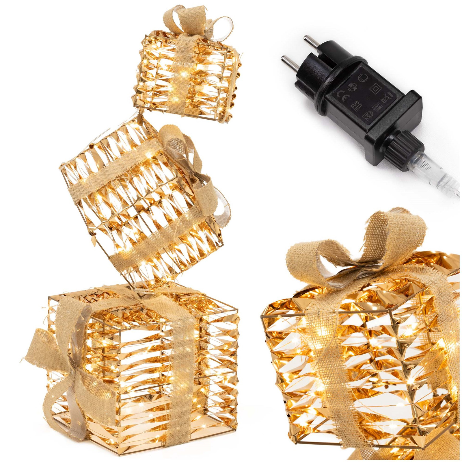 Nadaj magiczny klimat wnętrzom rozświetlając je świątecznymi ozdobami ledowymi! Nasz zestaw 3 ledowych prezentów to dekoracja inna niż wszystkie. Ozdobne pudełka prezentowe w kolorze złotym zostały przyozdobione kokardami, a w ich konstrukcji znajdują się druciki led świecące światłem o ciepłej, białej barwie. Każdy prezent ma inne rozmiary, dzięki czemu komplet tworzy spójną całość. Dekoracje zasilane są na prąd i jest wyposażona w długi kabel zasilający. Prezenty będą znakomicie prezentować się postawione przy choince, na kominku czy przed drzwiami wejściowymi. Ozdoby warto wykorzystać również do dekoracji witryn sklepowych i lokali użytkowych.