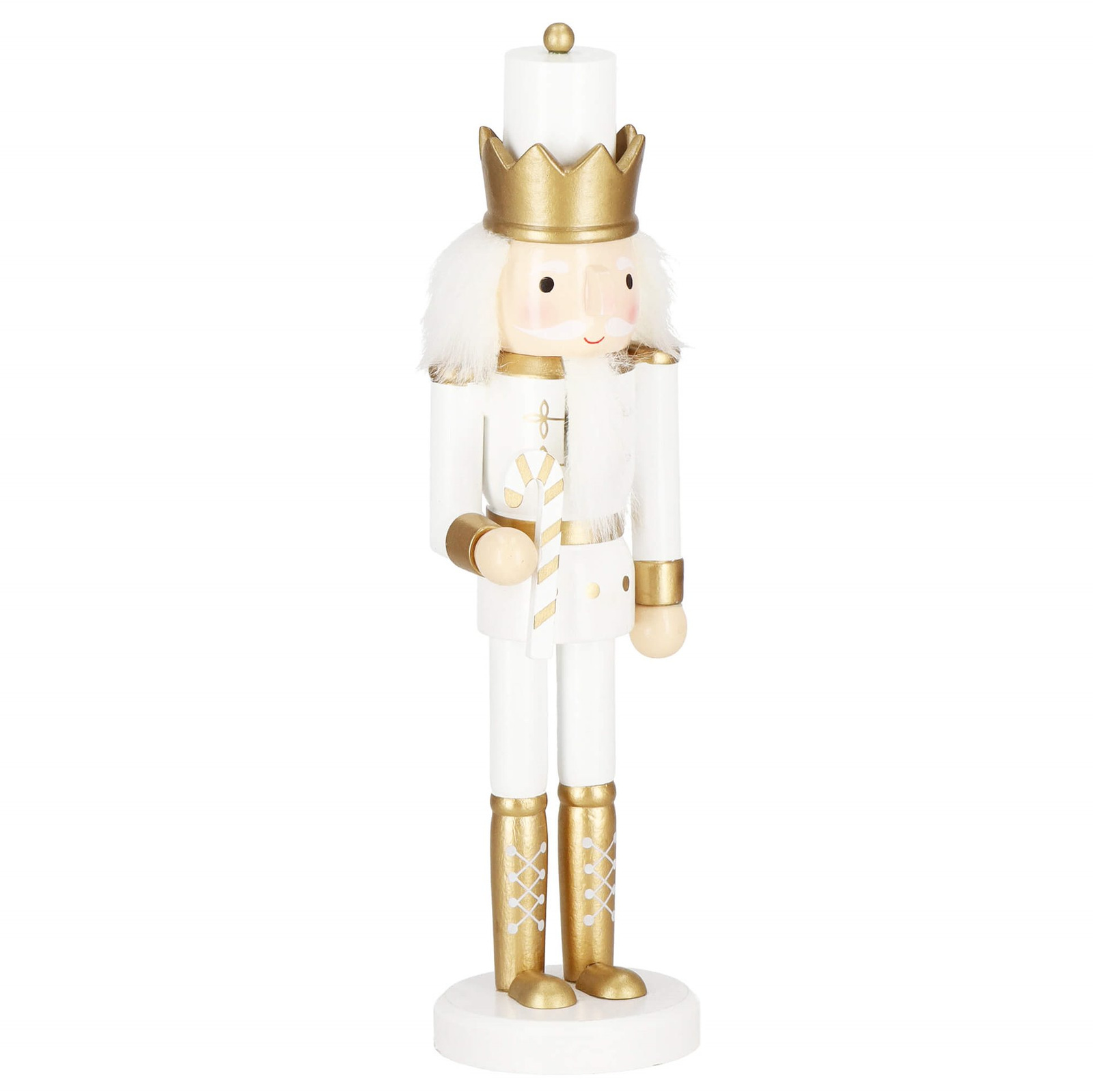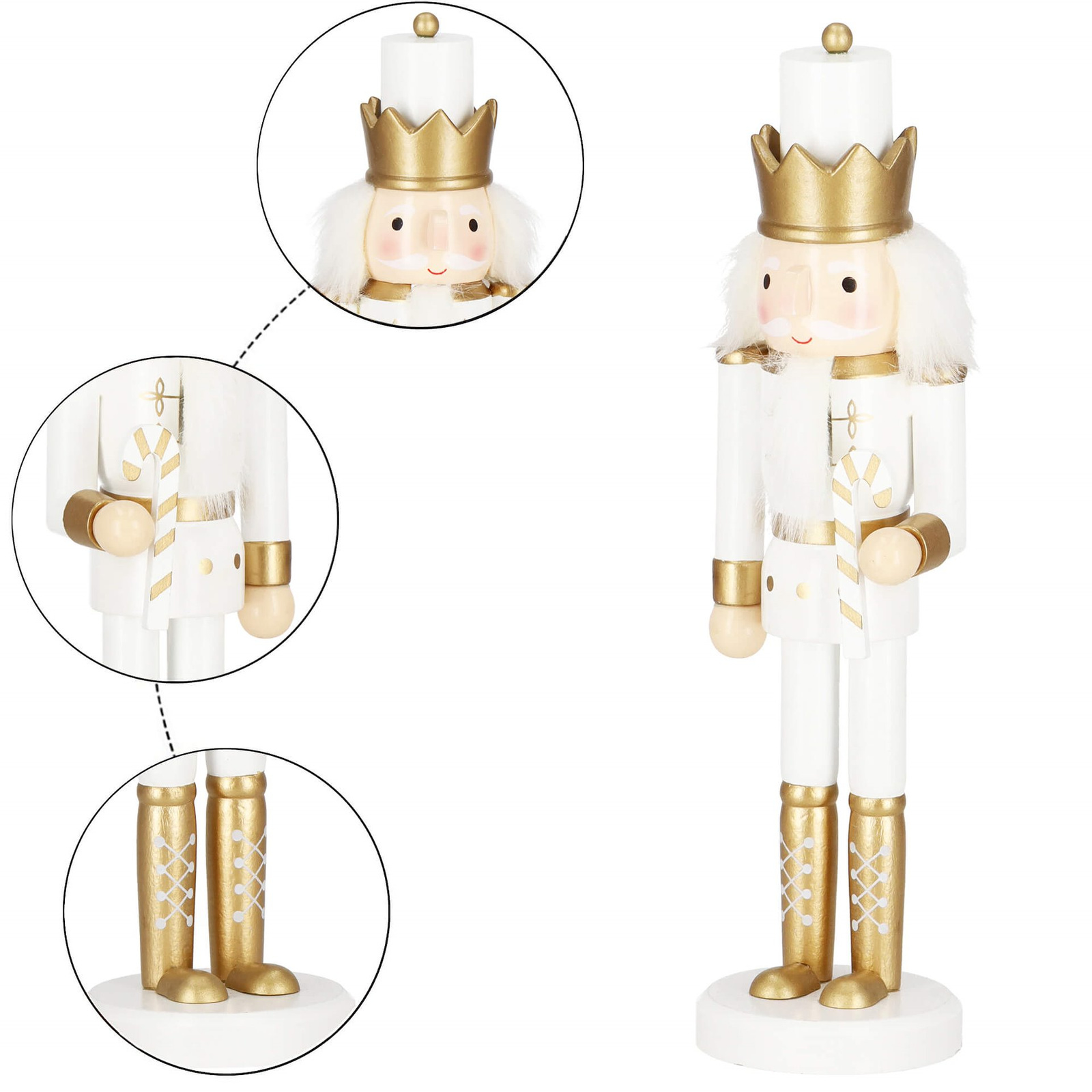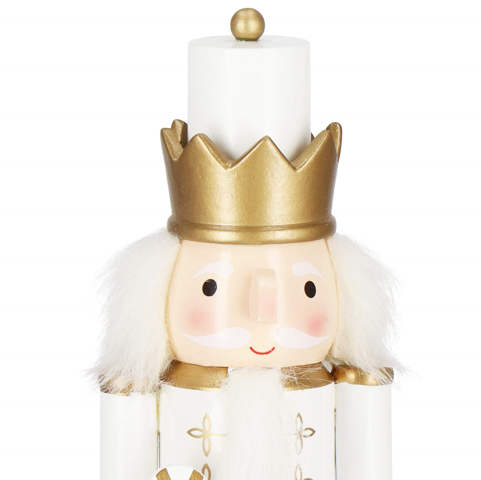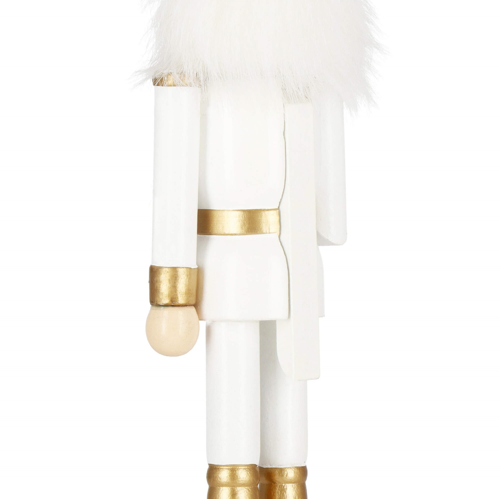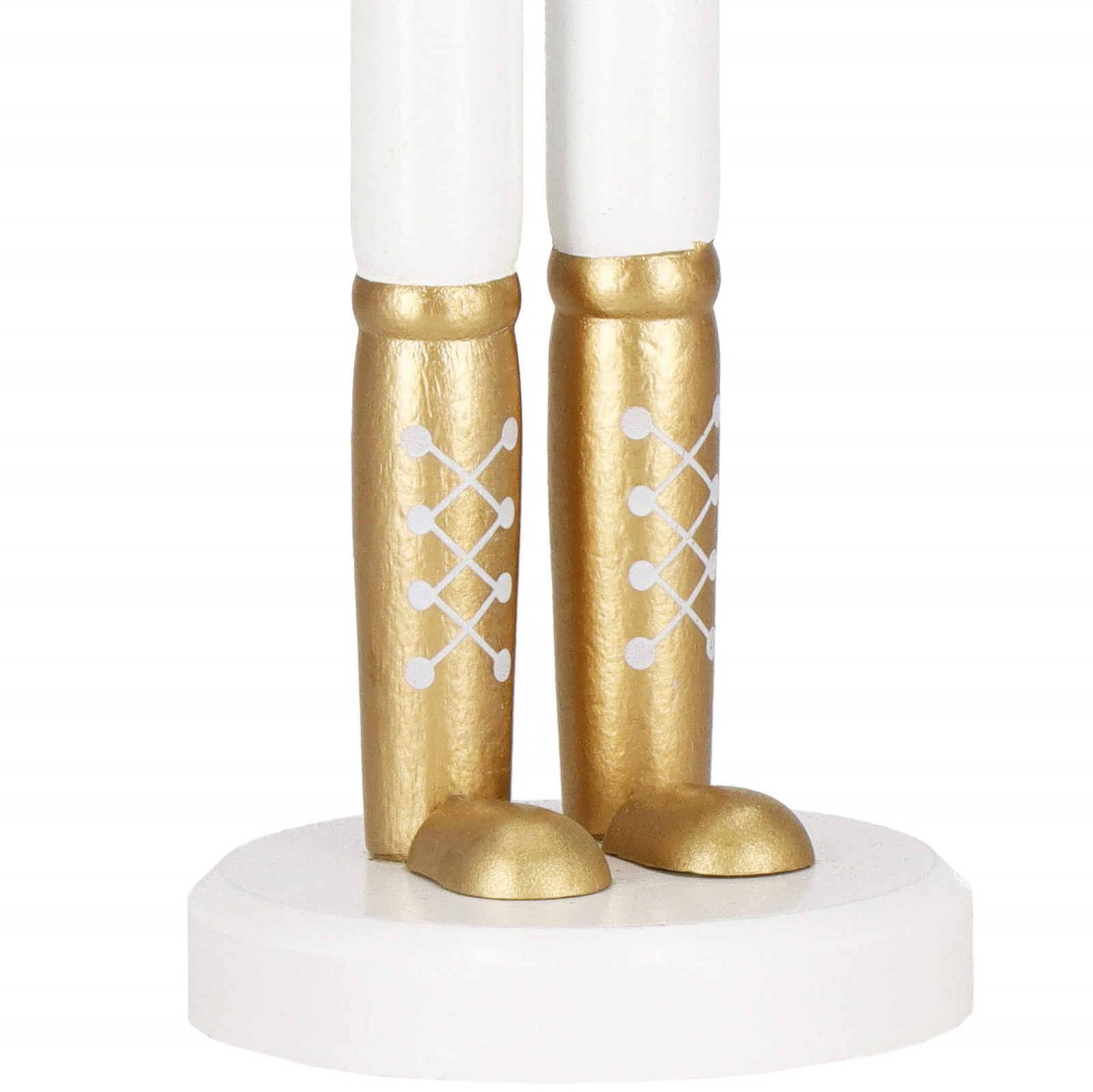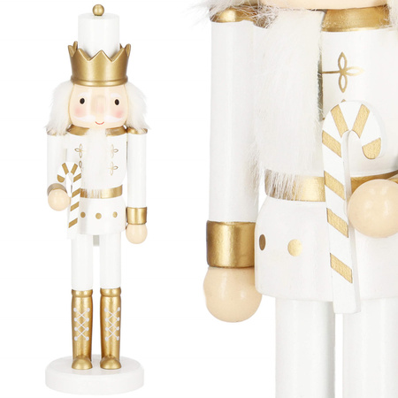Piękny biały dziadek do orzechów fantastycznie dopełni nie jedną, świąteczną aranżację. Kojarzy się on bardzo mocno z tradycją, jednak jego nowoczesna forma cudownie wpisuje się w obowiązujące trendy. Złota mieniąca się kolorystyka w połączeniu z klasyczną bielą tworzy niezwykle efektowne zestawienie. Majestatycznego wyglądu żołnierzykowi dodają detale takie laska, korona.