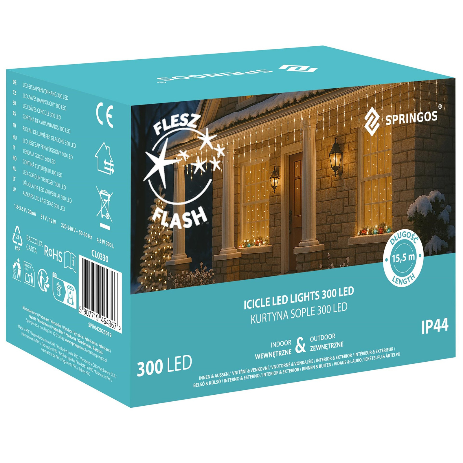 Kurtyna świetlna 300 led girlanda, lampki wewnętrzno-zewnętrzne 15,5 m sople biały zimny + flash