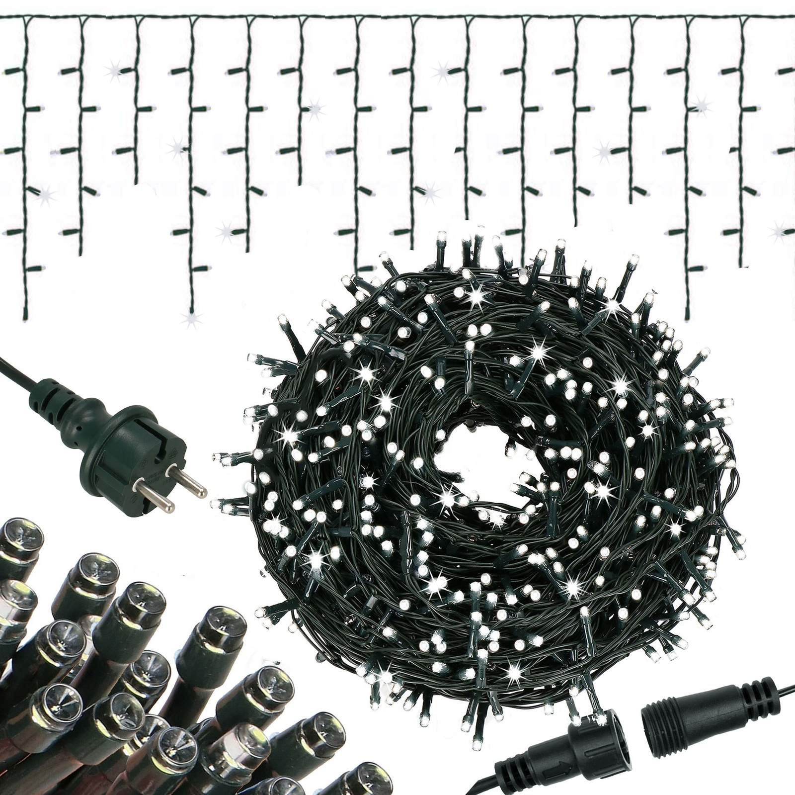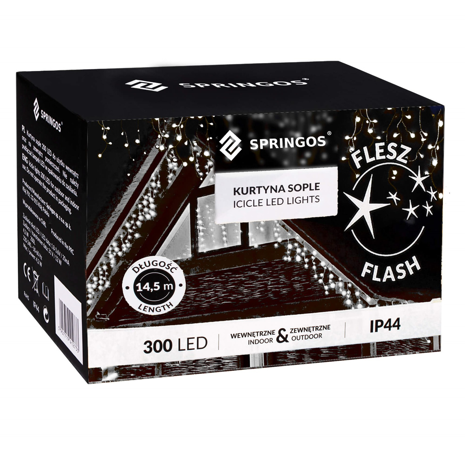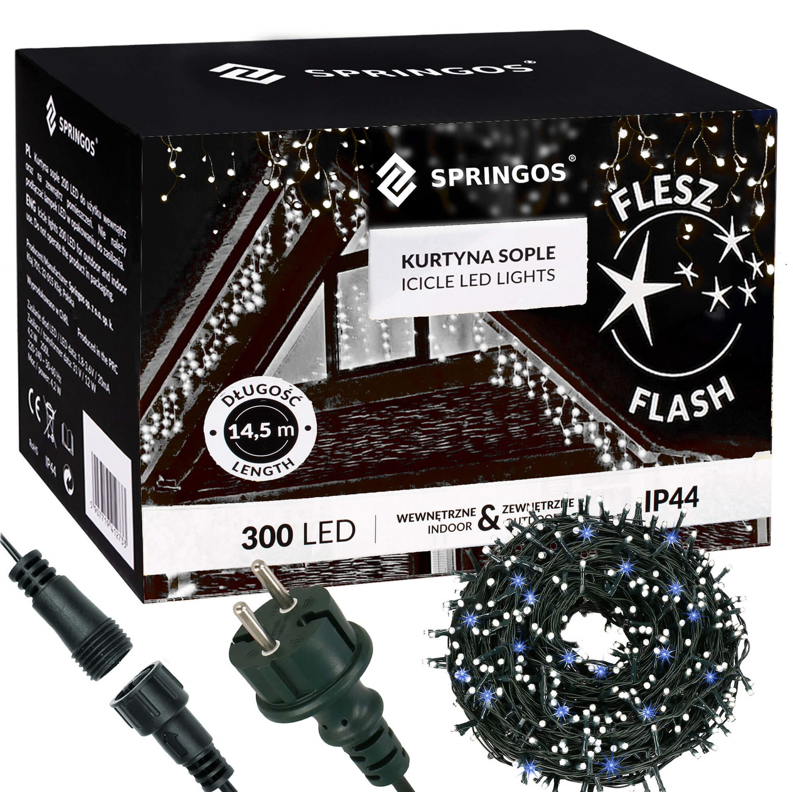 Kurtyna świetlna 300 led girlanda, lampki zewnętrzne sople zimny biały + flash