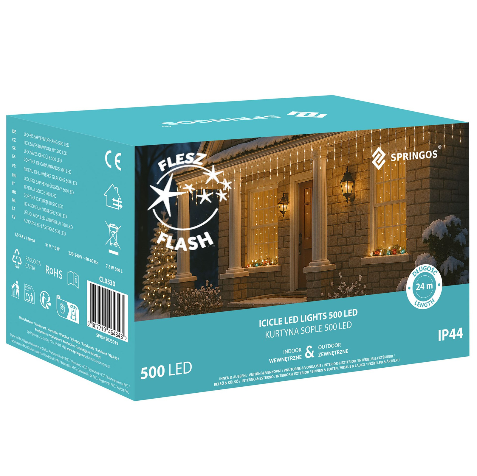 Kurtyna świetlna 500 led girlanda, lampki wewnętrzno-zewnętrzne sople biały zimny + flash
