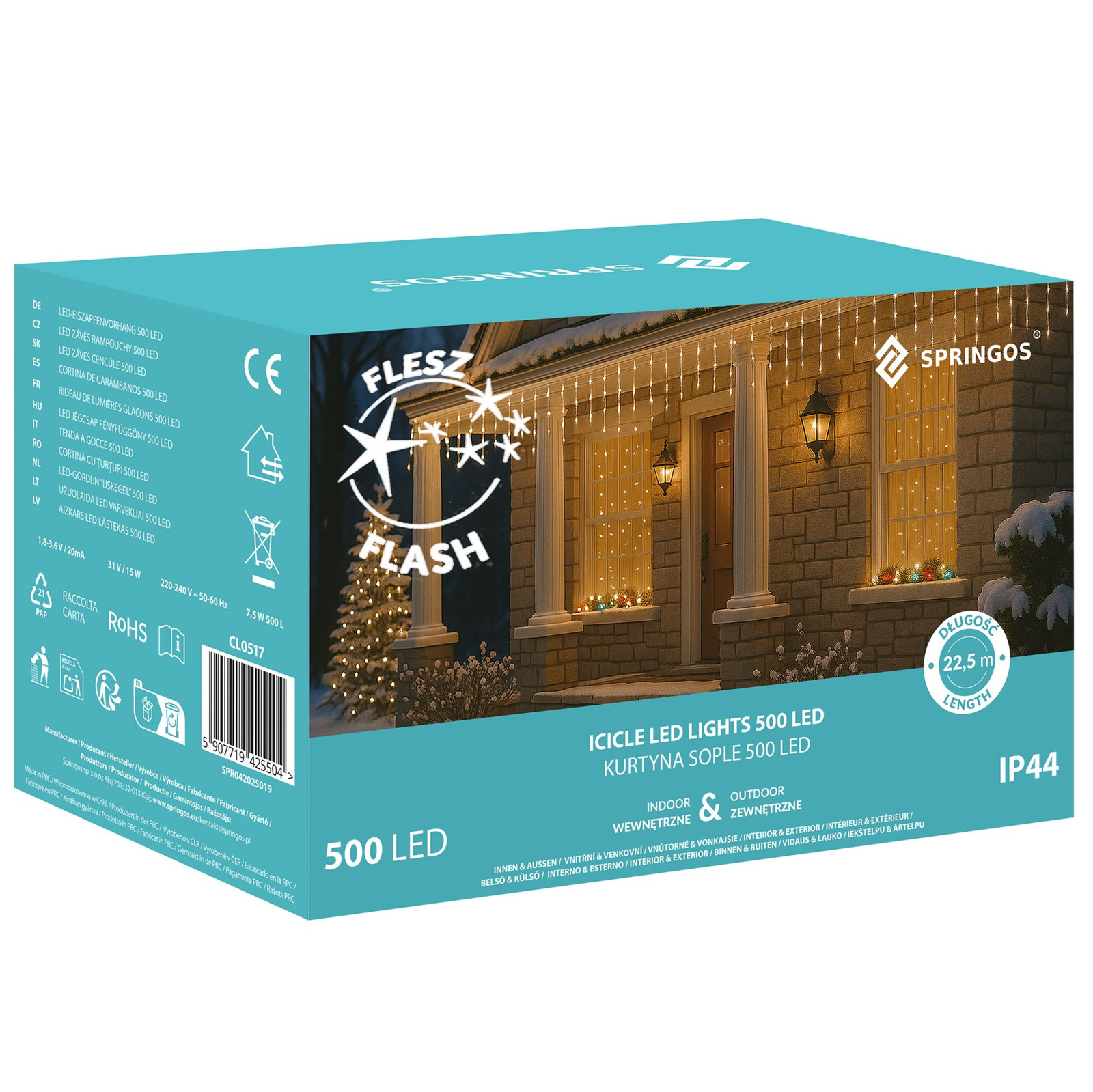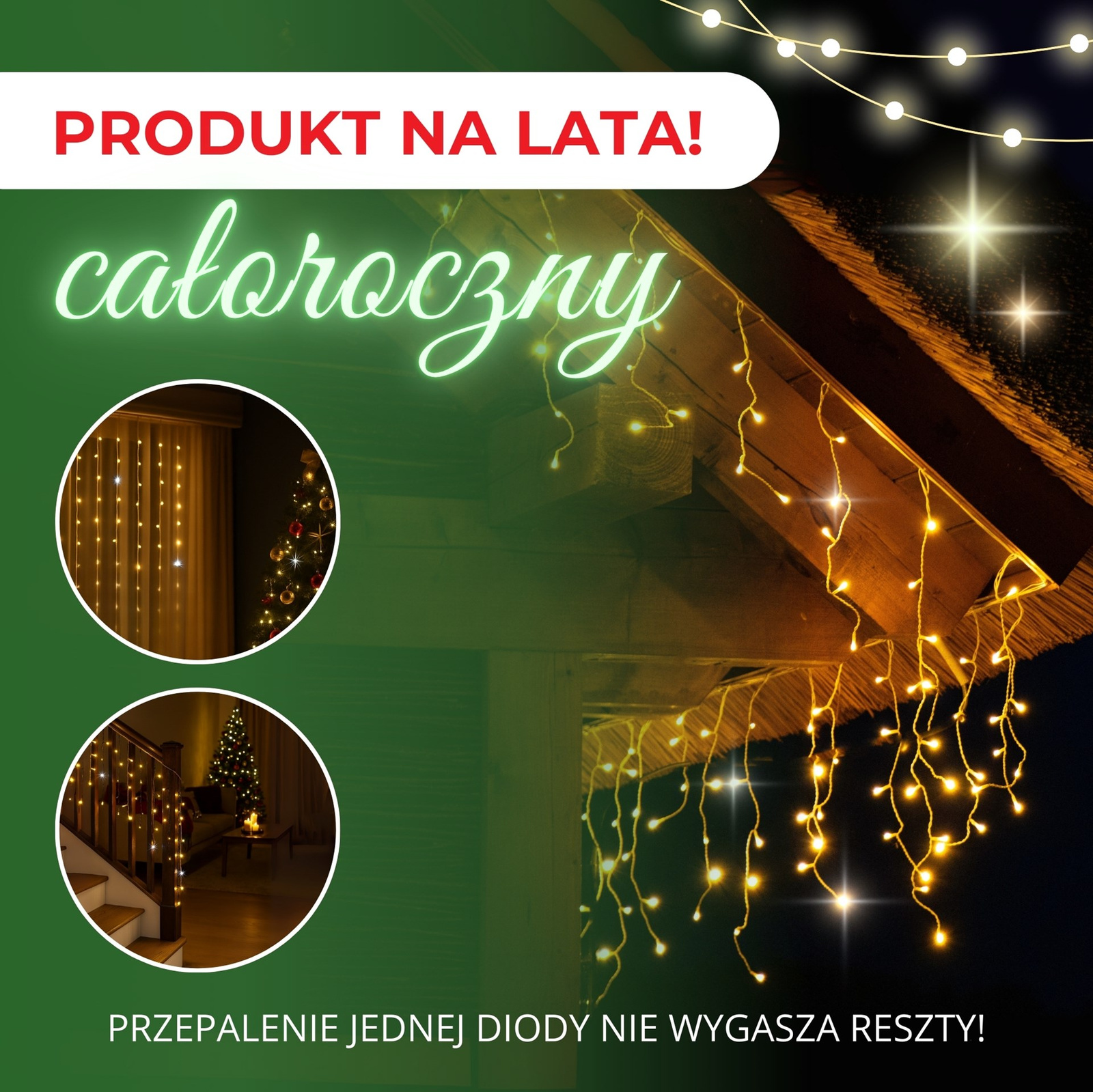 Kurtyna świetlna 500 led girlanda, lampki wewnętrzno-zewnętrzne sople ciepły biały z zimnym białym flash