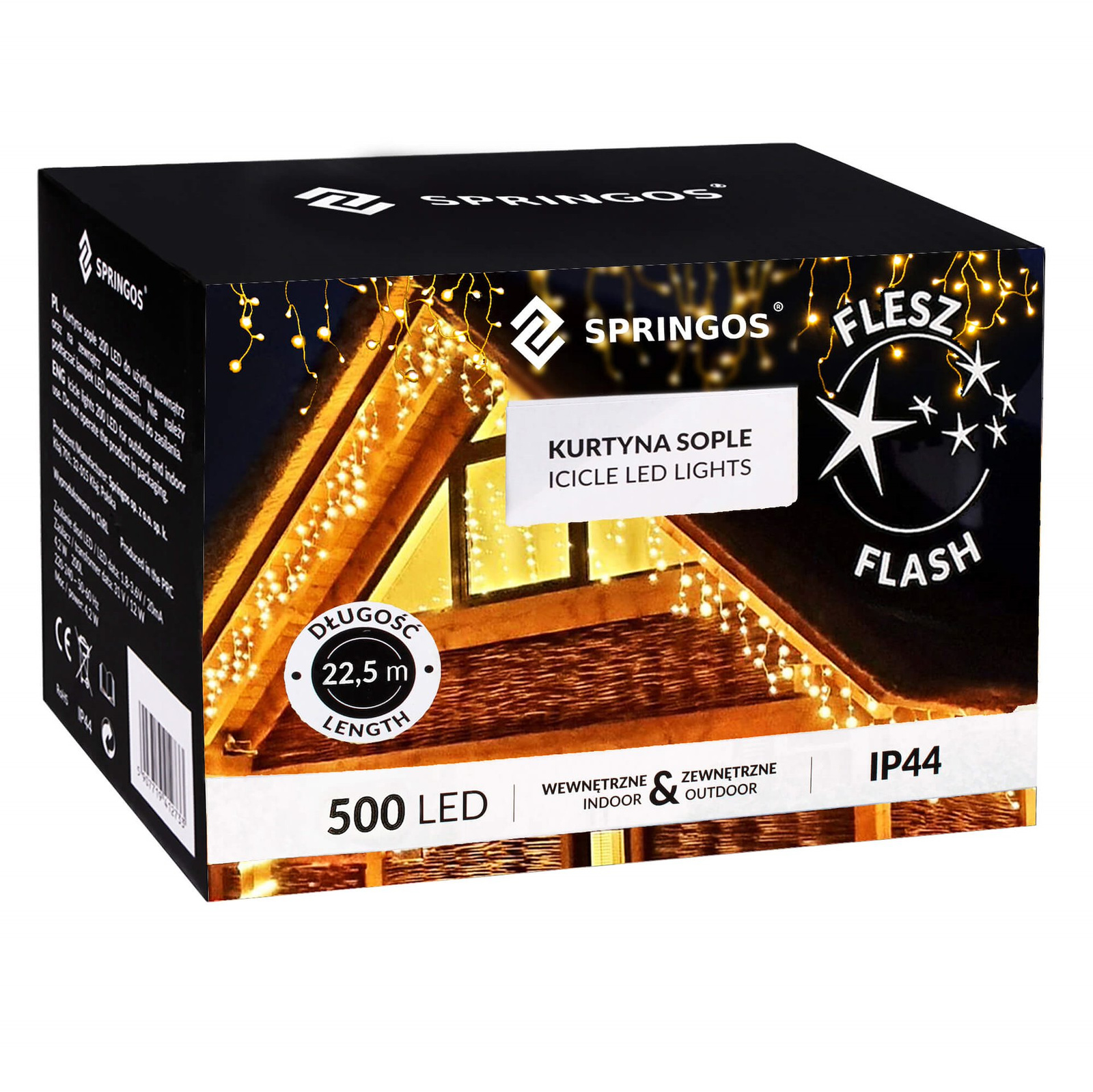 Kurtyna świetlna 500 led girlanda, lampki zewnętrzne sople ciepły biały + flash