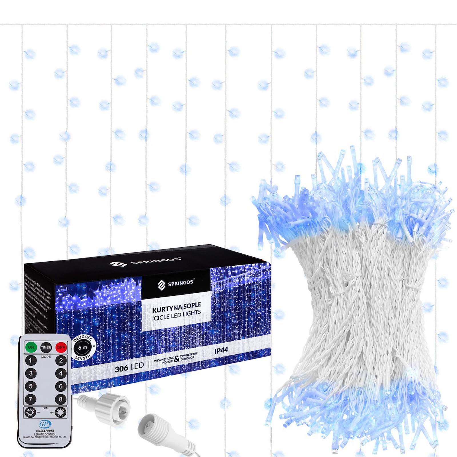 Kurtyna świetlna z pilotem 306 led girlanda, lampki wewnętrzno-zewnętrzne sople niebieski