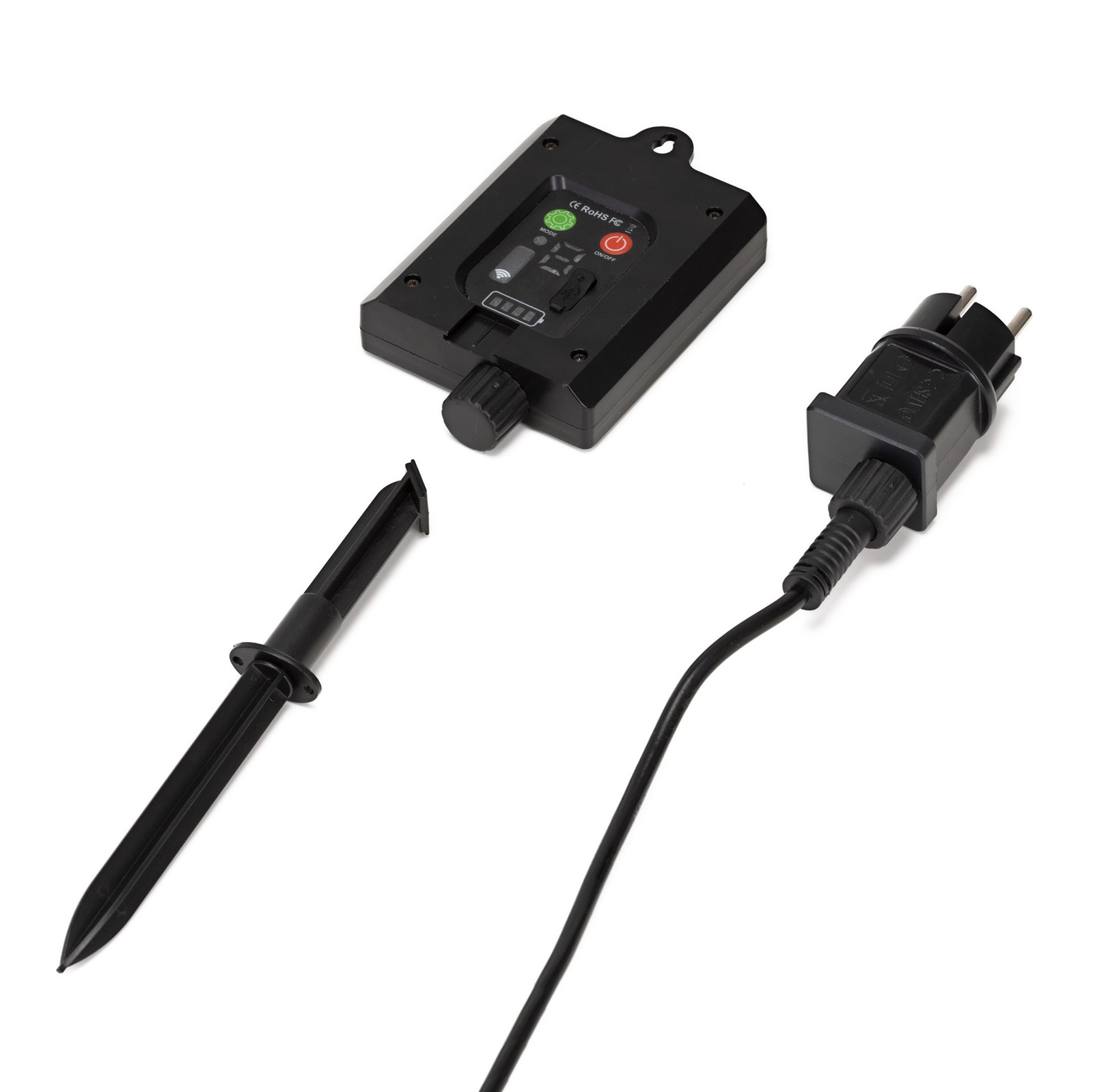 - W zestawie znajduje się dwuczęściowy kołek, umożliwiający stabilne wbicie akumulatora w ziemię