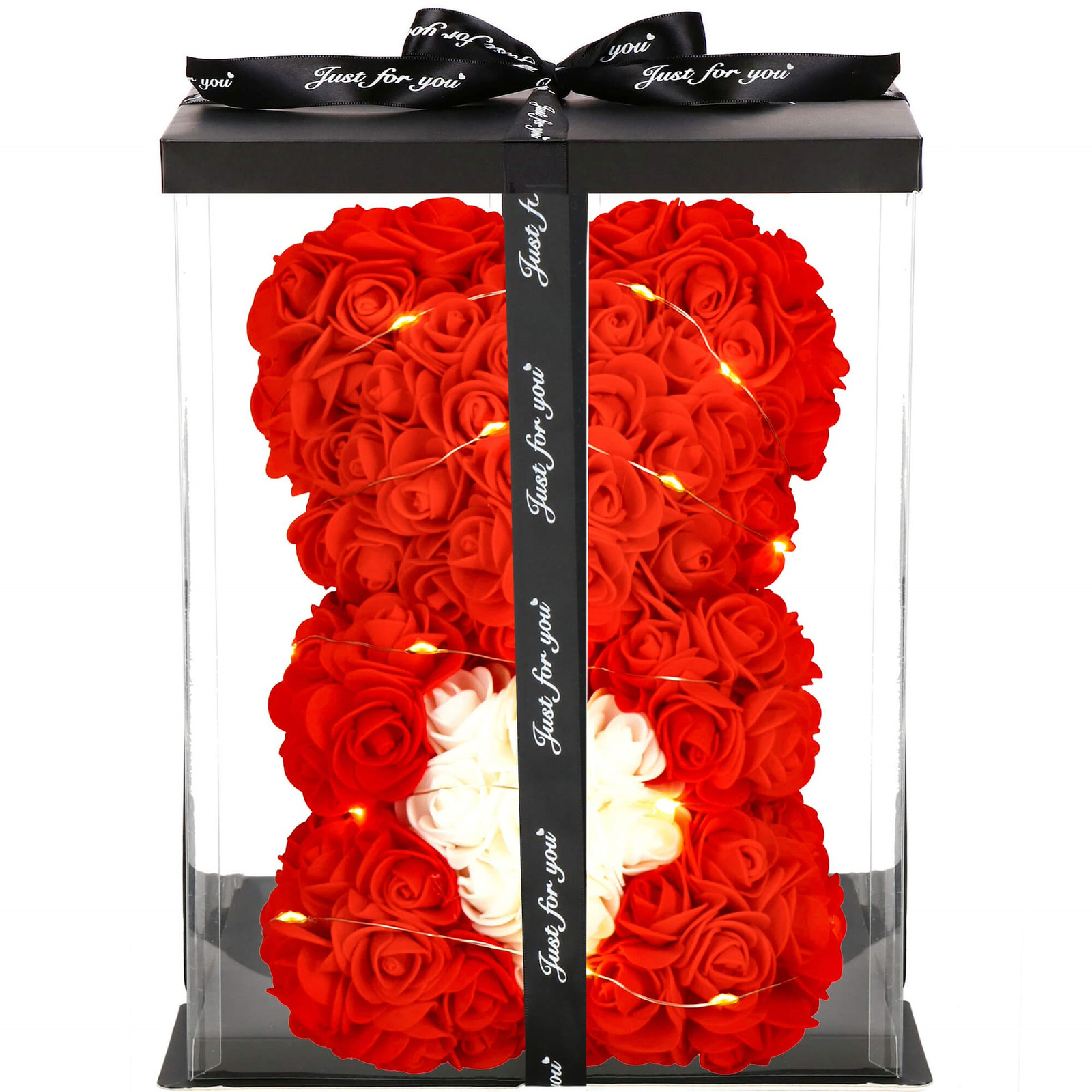 Miś czerwony z białym sercem z róż 25 cm w pudełku miś różany LED ciepły biały