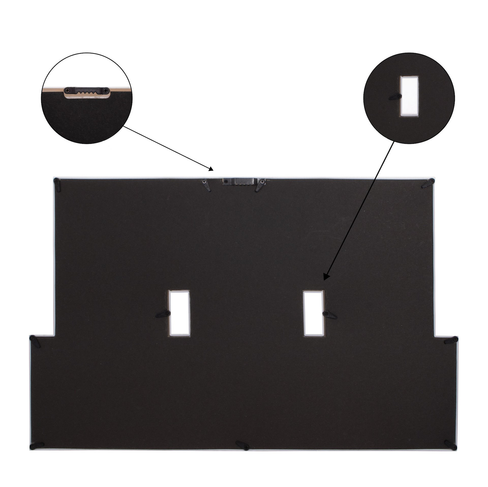 Ramki przeznaczone są do zdjęć o uniwersalnym rozmiarze 10x15 cm. Cała kompozycja posiada ramki o różnej orientacji - zarówno poziomej, jak i pionowej. Całość prezentuje się schludnie i estetycznie będąc idealną ozdobą każdego wnętrza.