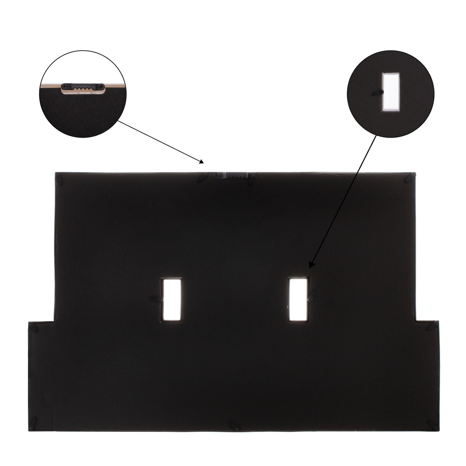 Ramki przeznaczone są do zdjęć o uniwersalnym rozmiarze 10x15 cm. Cała kompozycja posiada ramki o różnej orientacji - zarówno poziomej, jak i pionowej. Całość prezentuje się schludnie i estetycznie będąc idealną ozdobą każdego wnętrza.