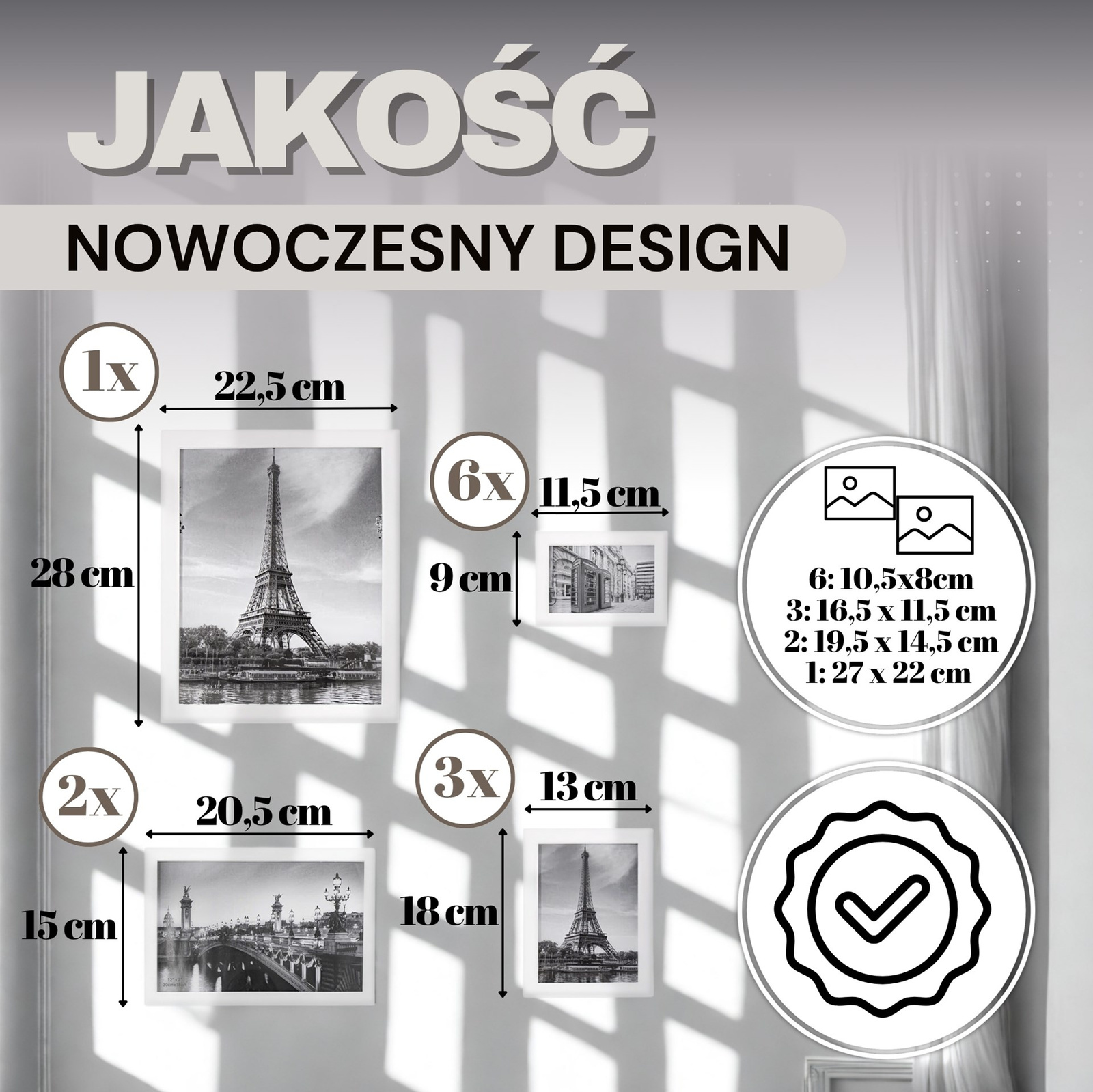 - Każda ramka wyposażona w praktyczną podpórkę: 20,5 / 14 / 12 / 8 cm (długość)