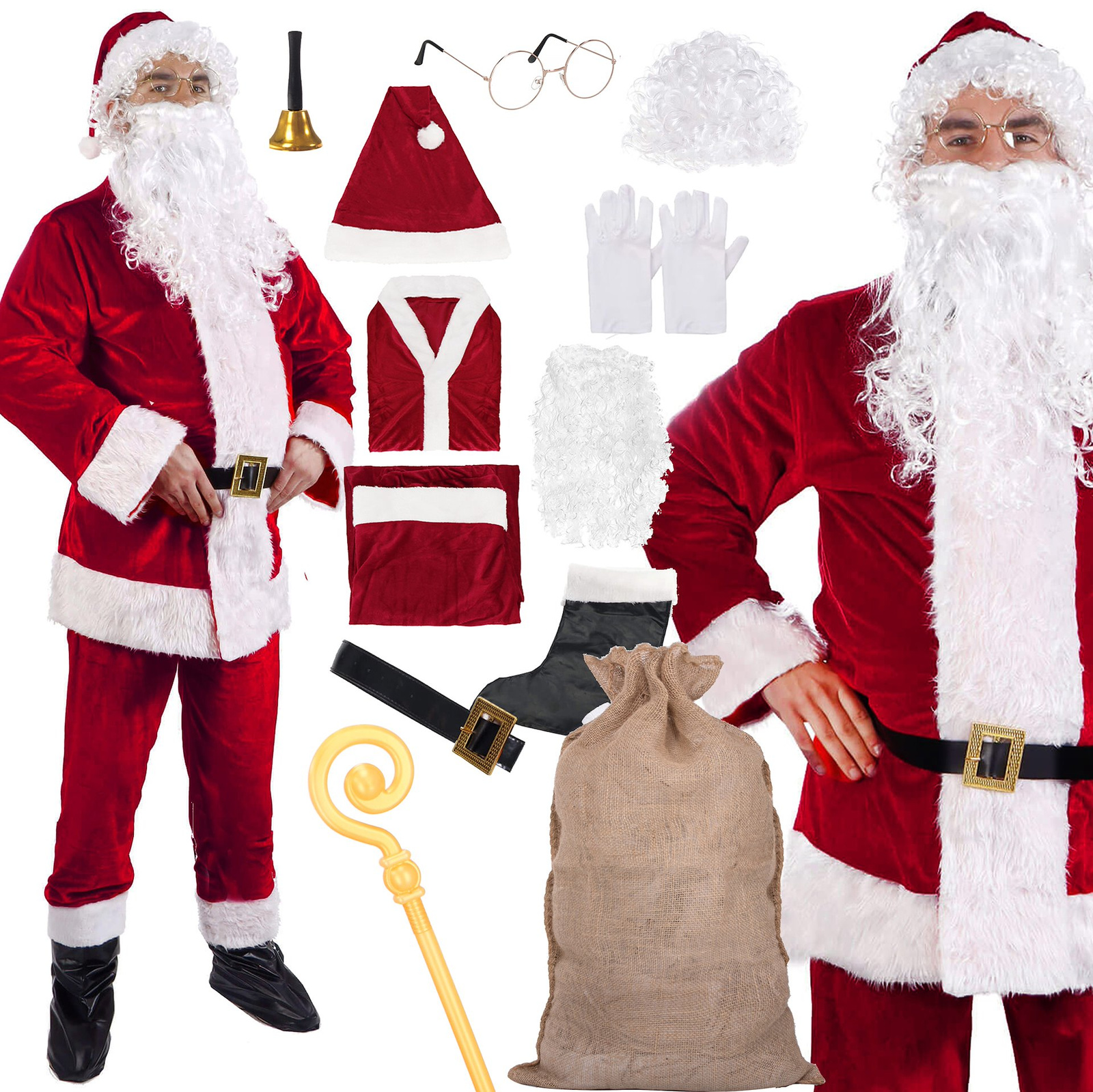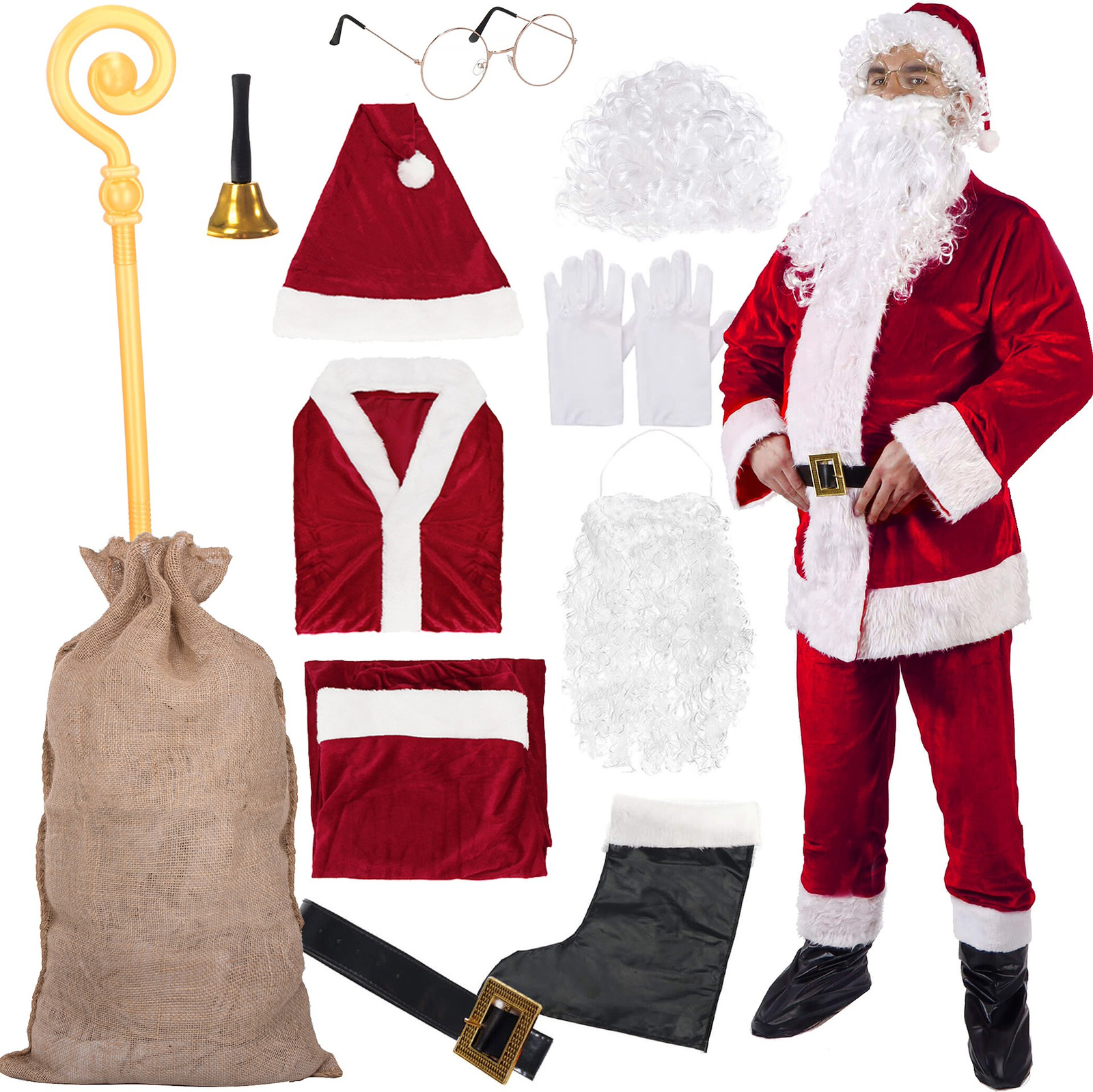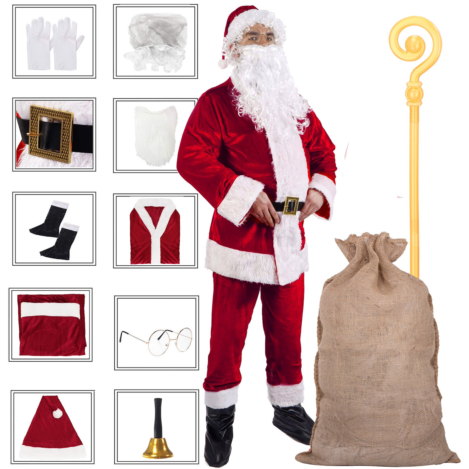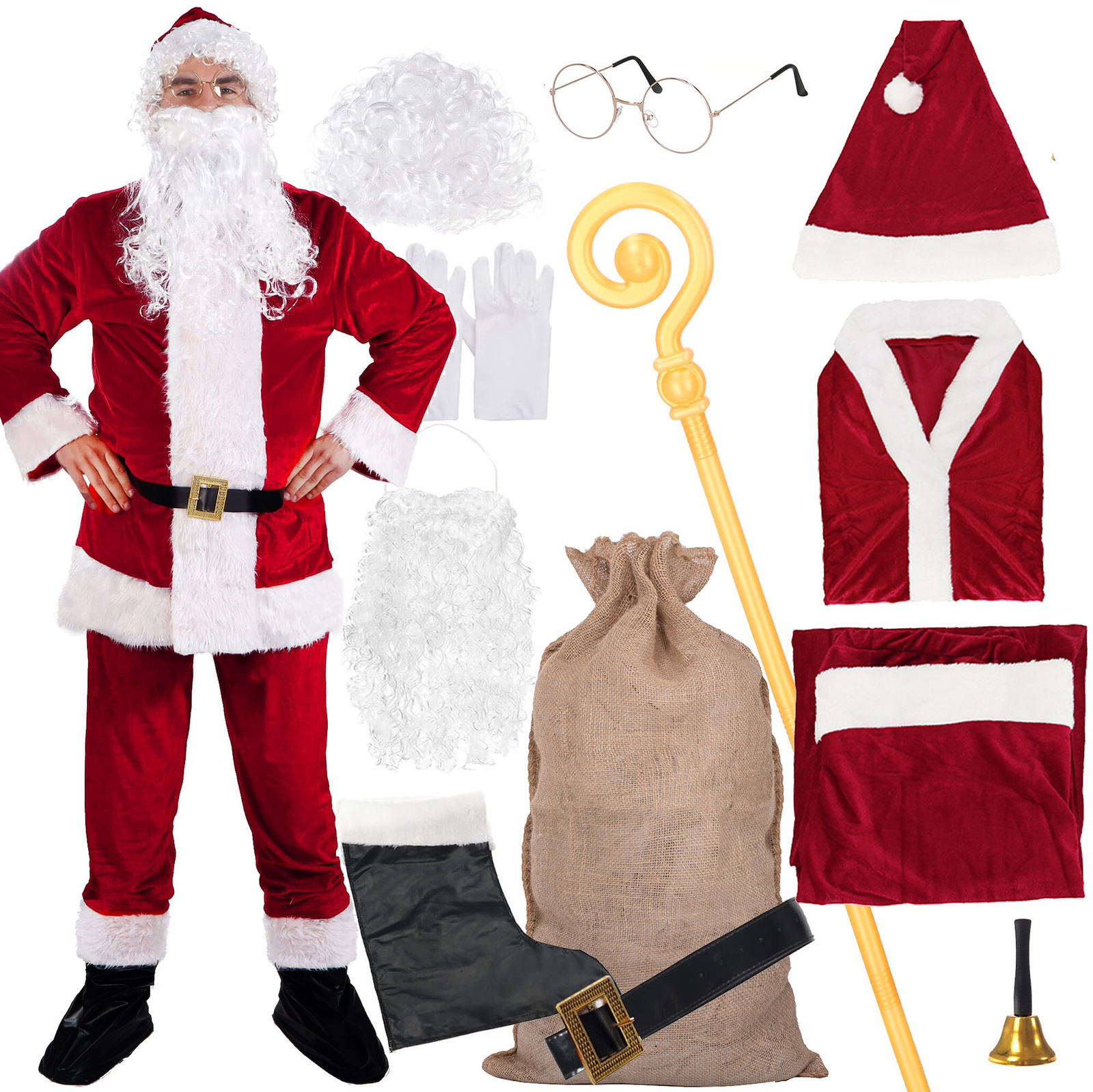• W skład zestawu wchodzą: kostium św. Mikołaja (9el.), dzwonek, worek jutowy na prezenty, laska św. Mikołaja
