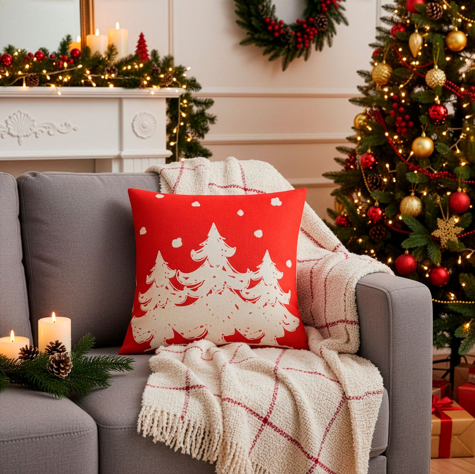 Dekoracyjne poszewki dodają pomieszczeniu głębi i elegancji, podkreślając świąteczną atmosferę.