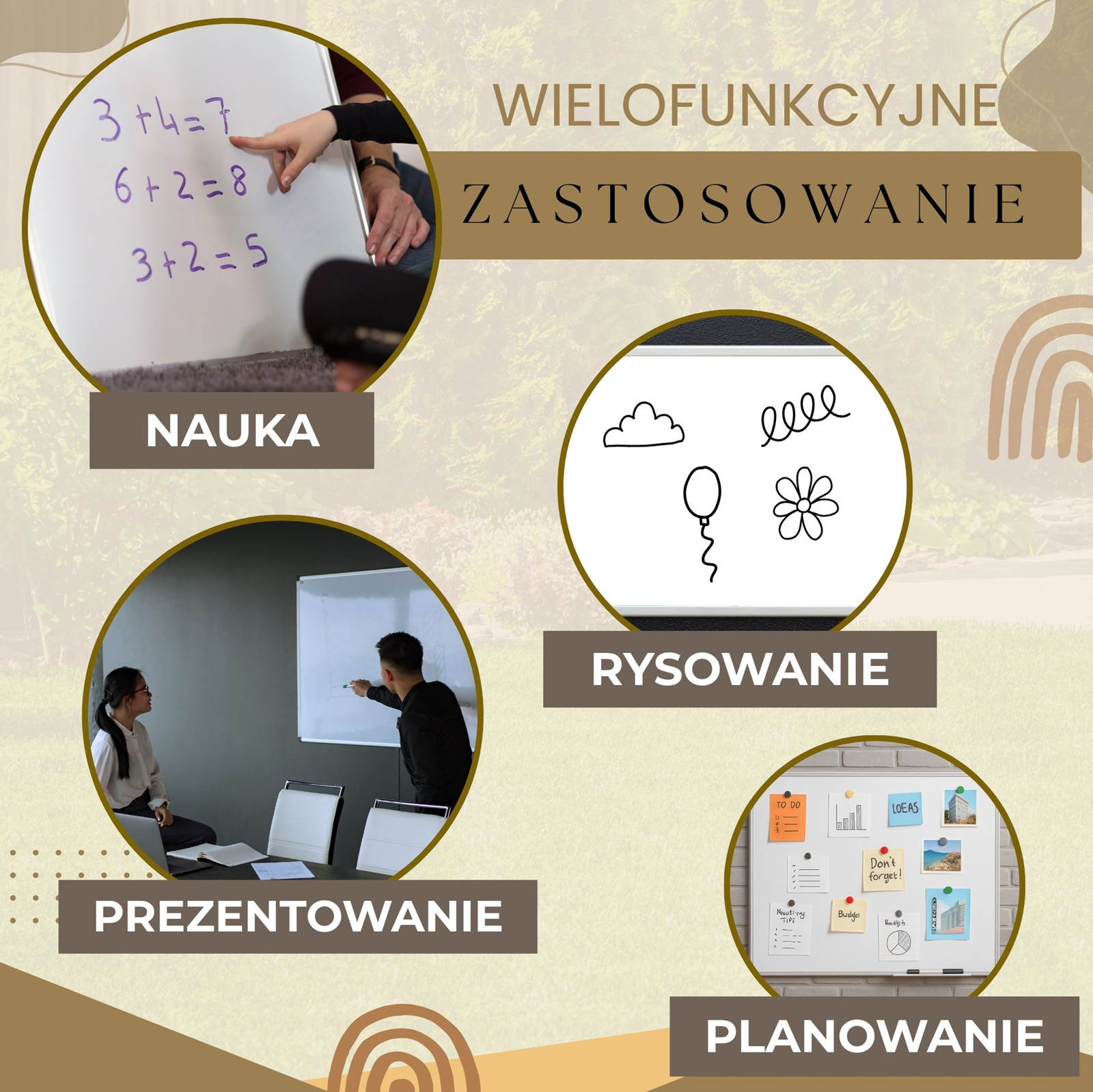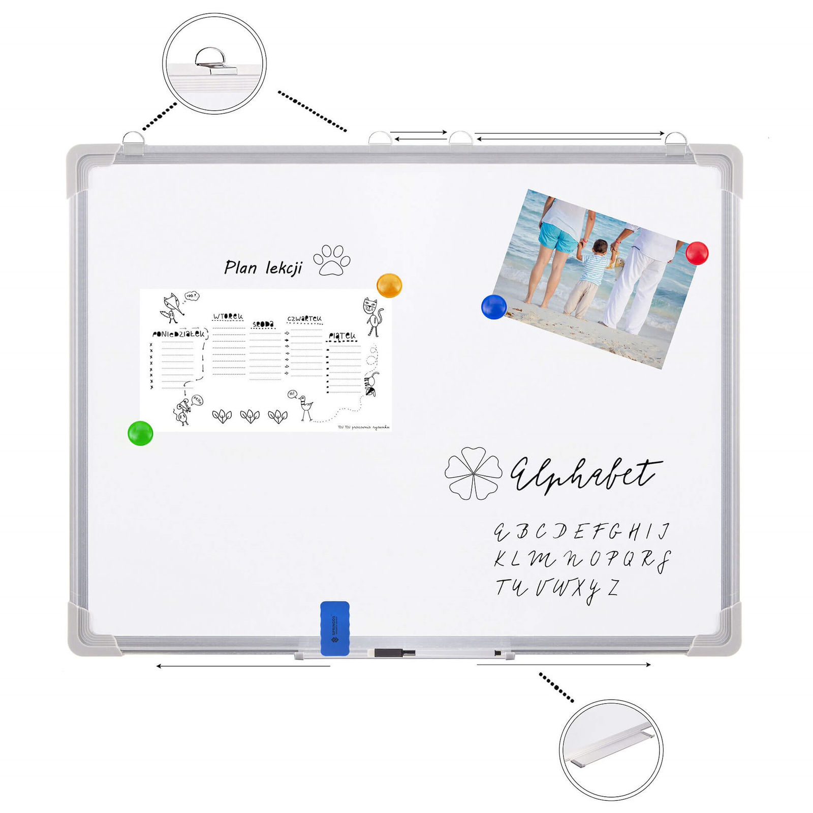 *Zdjęcia aranżacyjne, oraz dodatkowe grafiki pełnią funkcję poglądową. Widoczne na nich dodatkowe akcesoria nie są częścią zestawu. Na tej ofercie zakupisz wyłącznie tablicę magnetyczną suchościeralną.