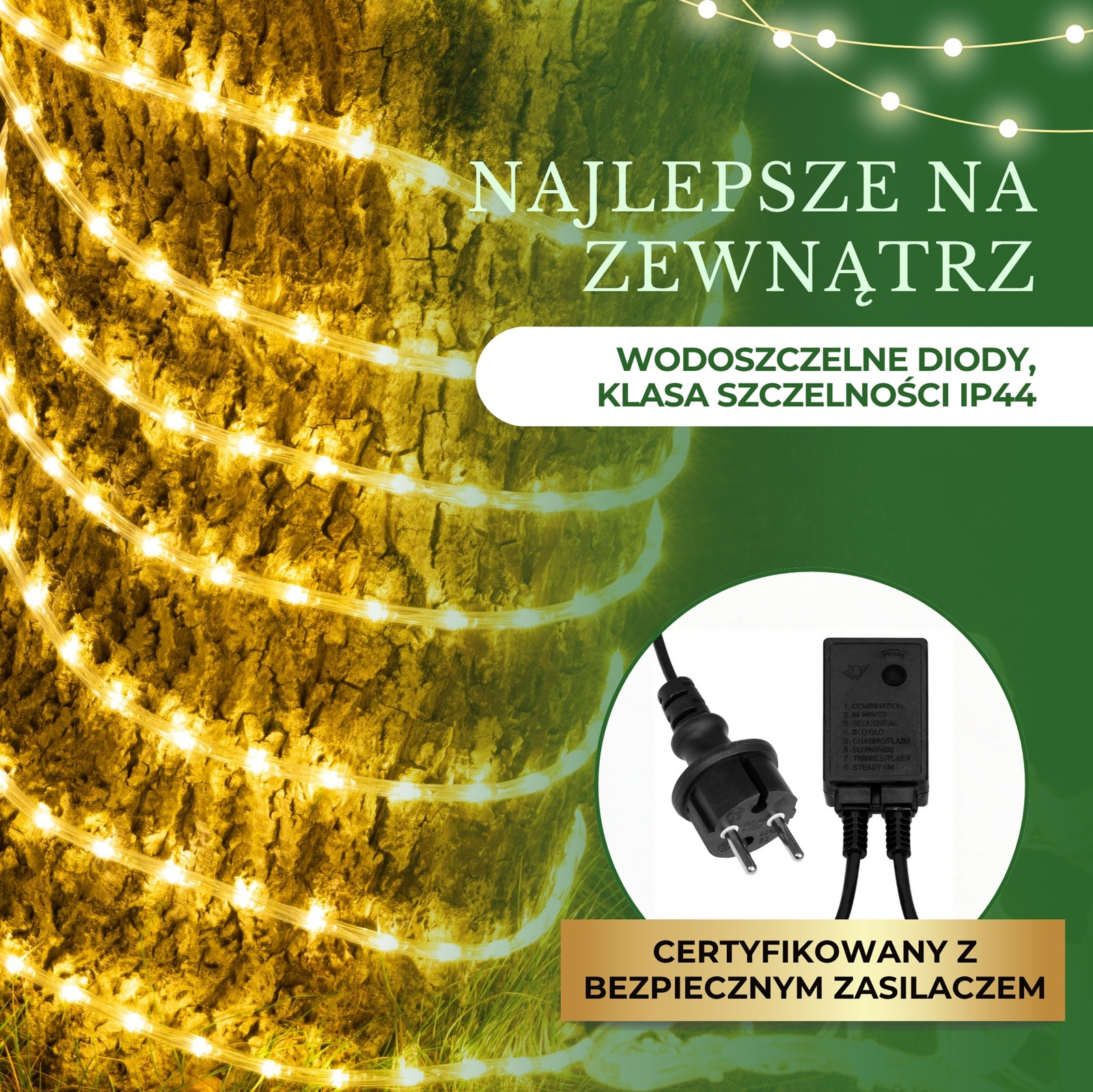 Wąż świetlny LED o długości 10 metrów, wyposażony w 240 diod emitujących ciepłe, białe światło. Dzięki programatorowi możesz wybierać spośród ośmiu różnych trybów świecenia, aby dostosować oświetlenie do swoich preferencji. Wysoka klasa szczelności IP44 zapewnia odporność na warunki atmosferyczne, co sprawia, że jest idealny zarówno do użytku wewnętrznego, jak i zewnętrznego. Energooszczędne diody LED gwarantują długą żywotność i niski pobór energii. Ten wąż świetlny to doskonałe rozwiązanie na świąteczne dekoracje, imprezy plenerowe oraz codzienne oświetlenie ogrodu. Dzięki solidnemu wykonaniu i łatwemu montażowi spełni oczekiwania nawet najbardziej wymagających użytkowników. Wprowadź ciepły blask do swojego otoczenia i ciesz się wyjątkowym klimatem przez cały rok.
