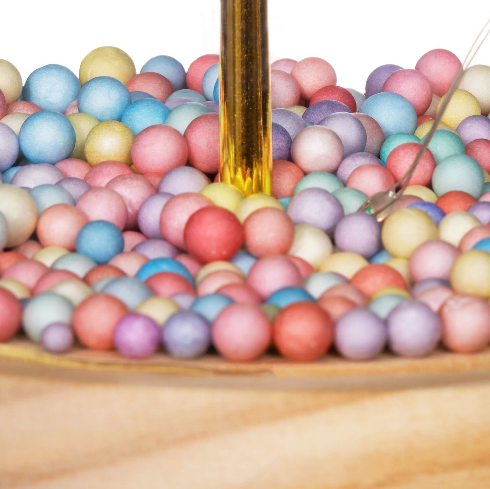 - Wewnątrz kolorowe kuleczki, w pastelowych odcieniach