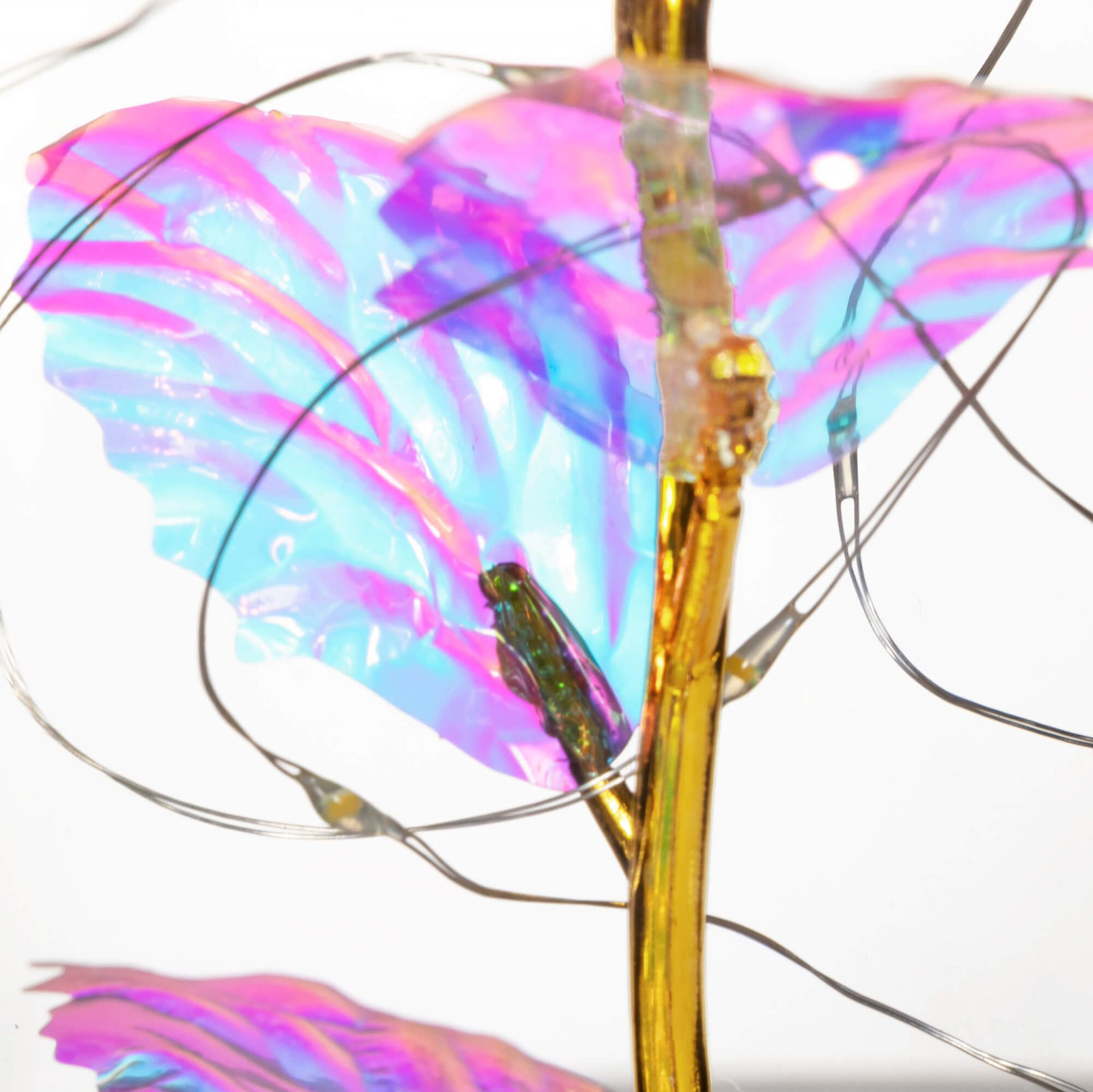 - Wysoką wartość dekoracyjną – precyzyjnie wykonany kwiat umieszczony jest w szkle, w którym dodatkowo znajdują się druciki LED, oświetlające całą ozdobę.