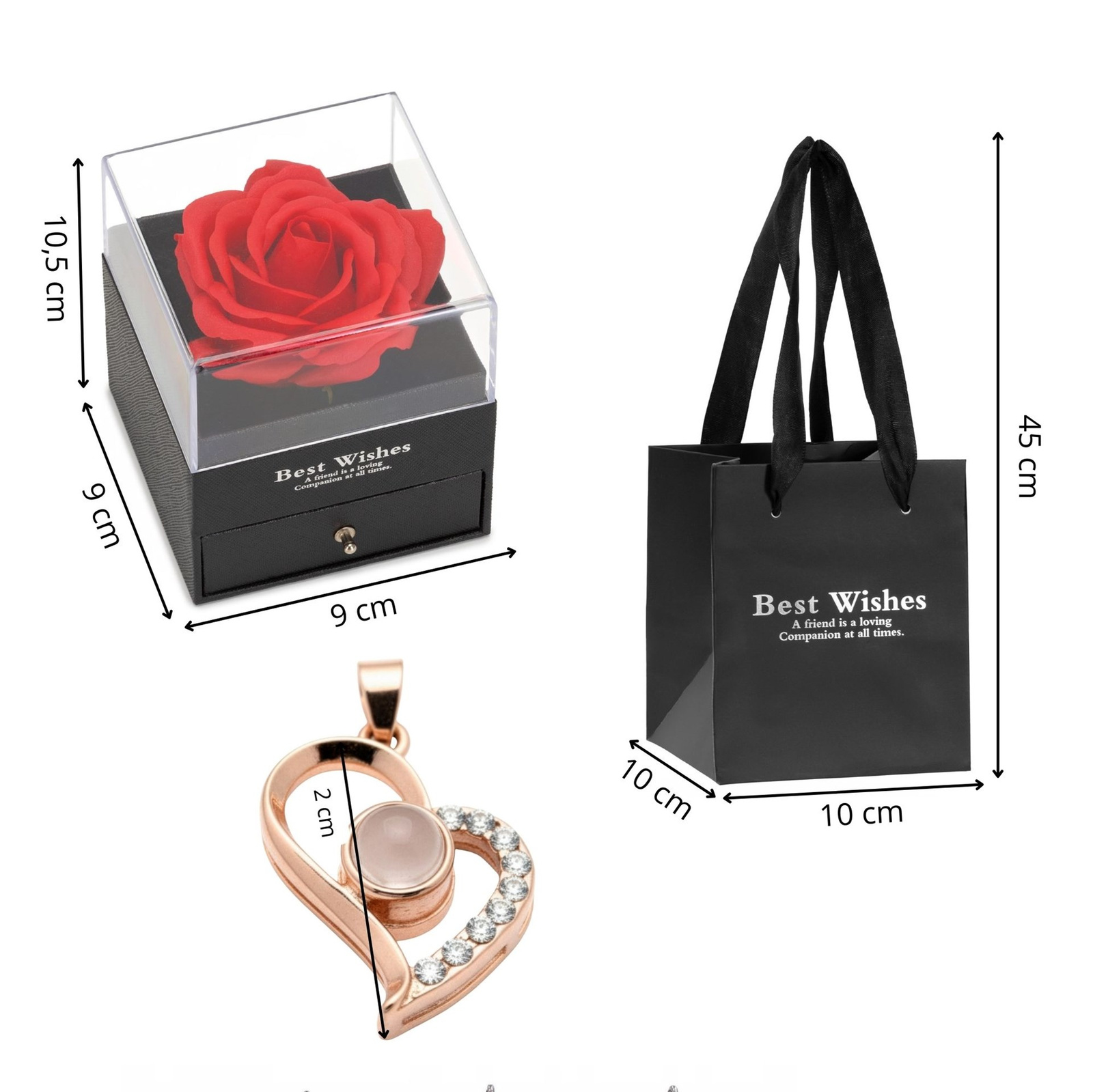 Ten wyjątkowy komplet został zaprojektowany jako gotowy prezent, który zachwyca formą i przekazem. Elegancki naszyjnik z motywem serca stanowi subtelną ozdobę, a jednocześnie nośnik ukrytego znaczenia. W centralnym elemencie zawieszki znajduje się specjalny kamień, w którym zapisano słowa "kocham cię" w wielu językach. To detal, który czyni biżuterię niepowtarzalną i bardzo osobistą. Całość została umieszczona w stylowym pudełku z przezroczystą pokrywką, dzięki czemu prezent efektownie prezentuje się jeszcze przed otwarciem. Wewnątrz znajduje się dekoracyjna róża, która nie więdnie i przez długi czas zachowuje swój estetyczny wygląd. Zestaw uzupełnia kartka na osobiste życzenia, pozwalająca nadać upominkowi indywidualny charakter. Dołączona torba prezentowa sprawia, że całość jest gotowa do wręczenia.