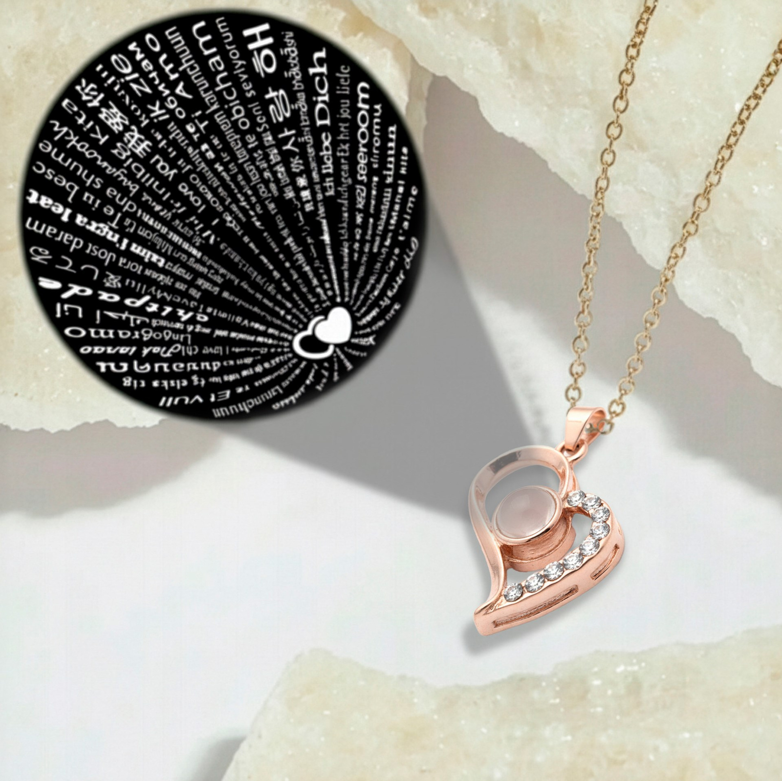 • Zawieszka naszyjnika posiada kamyczek, w którym zapisane jest słowo „kocham cię” w 100 językach. Napisy można odczytać na dwa sposoby: przyłożyć oko do kamyczka, aby zobaczyć je bezpośrednio, lub przyłożyć kamyczek do źródła światła (np. latarki w telefonie), aby wyświetlić napis na ścianie.